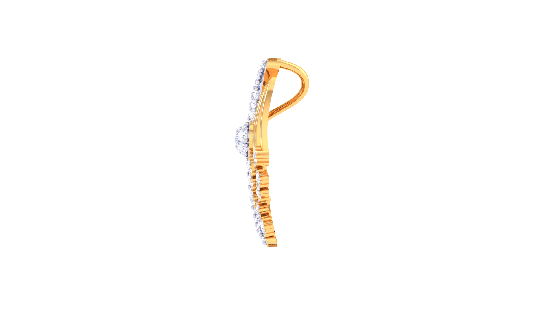 Its sculpted curve frames a central diamond accent, while three vertical gold bars cascade downward, each tipped with a trio of diamonds arranged in elegant clusters.