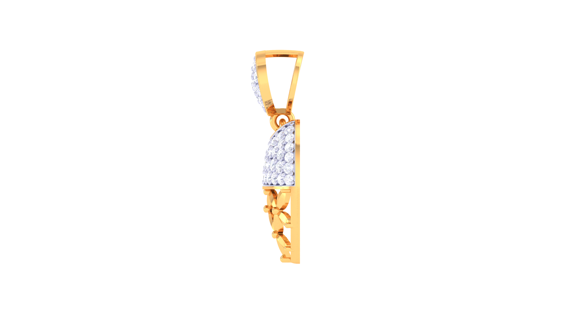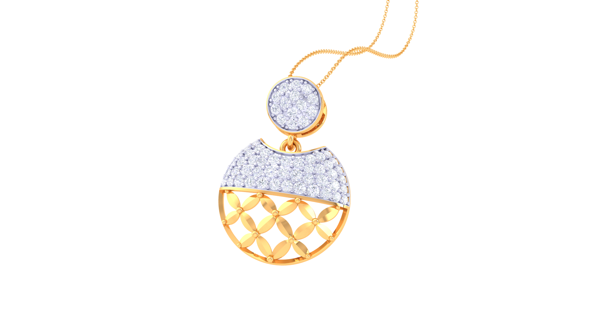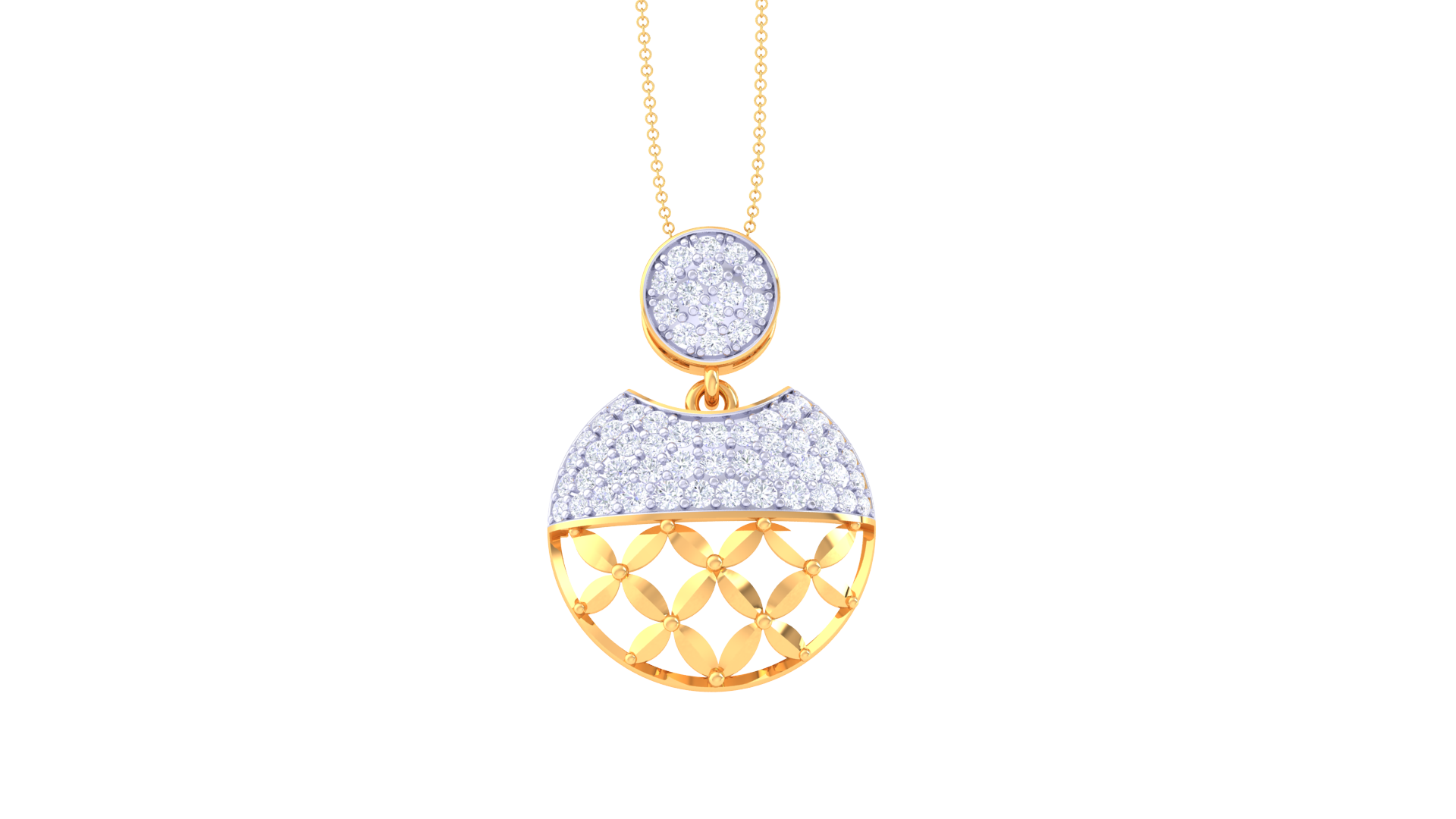 The design features a dual-section composition: a circular diamond-studded top and a semi-circular lower half that blends shimmering stones with an intricate gold lattice.
