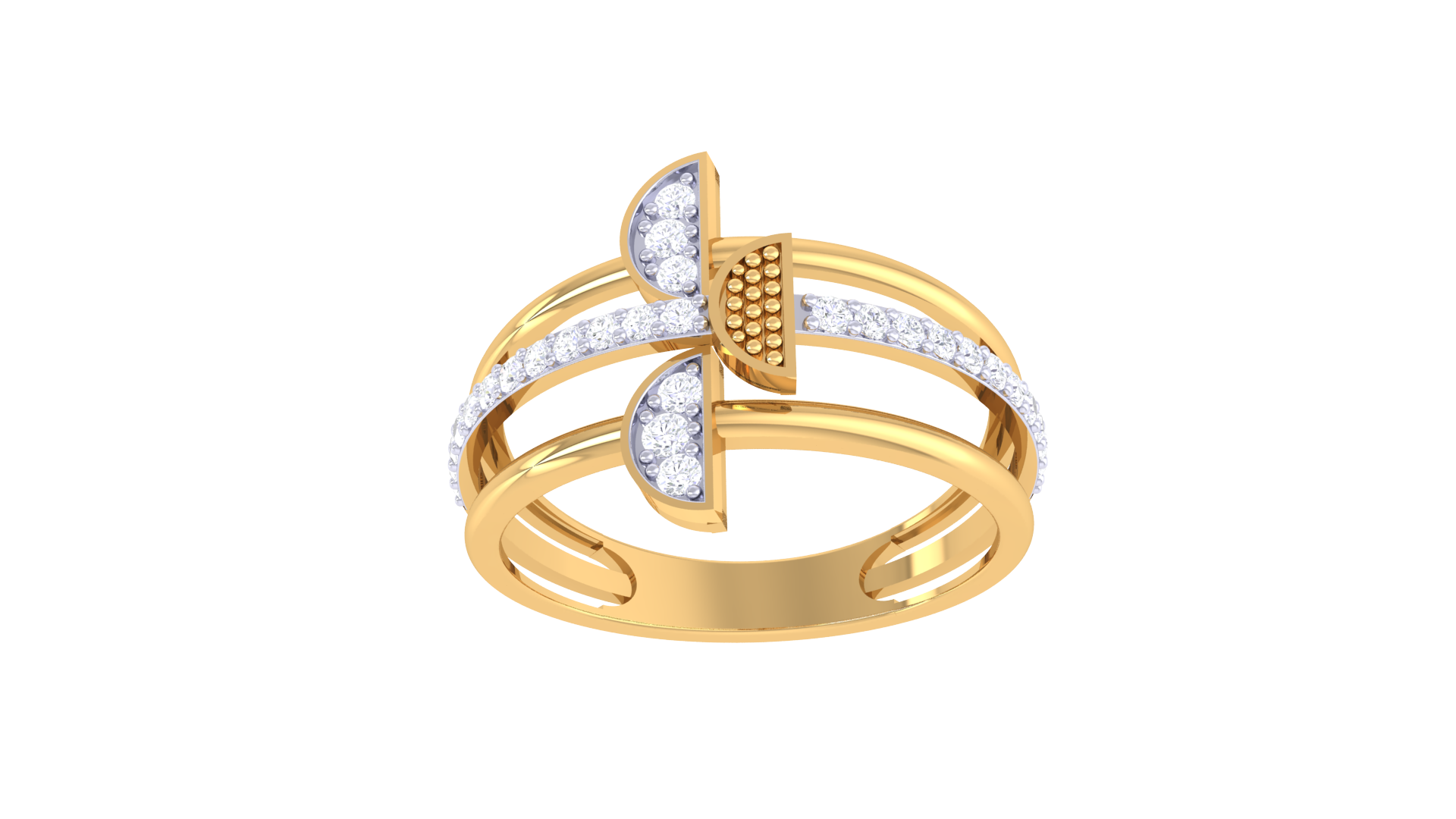 The centerpiece features three petal-like forms—two shimmering with 0.20 carats of brilliant-cut diamonds, and one textured in radiant gold, dotted with raised accents for added depth.