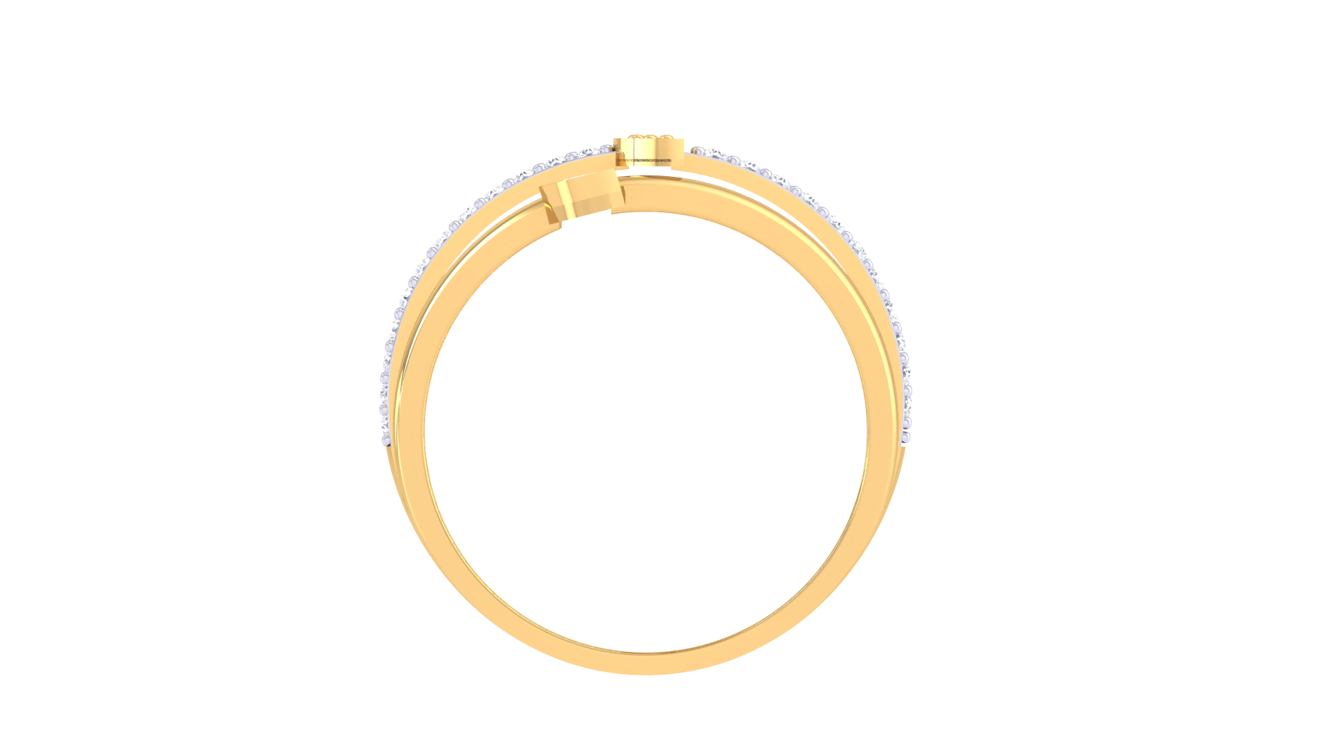 The split band design, also adorned with diamond accents, enhances the ring’s graceful silhouette.