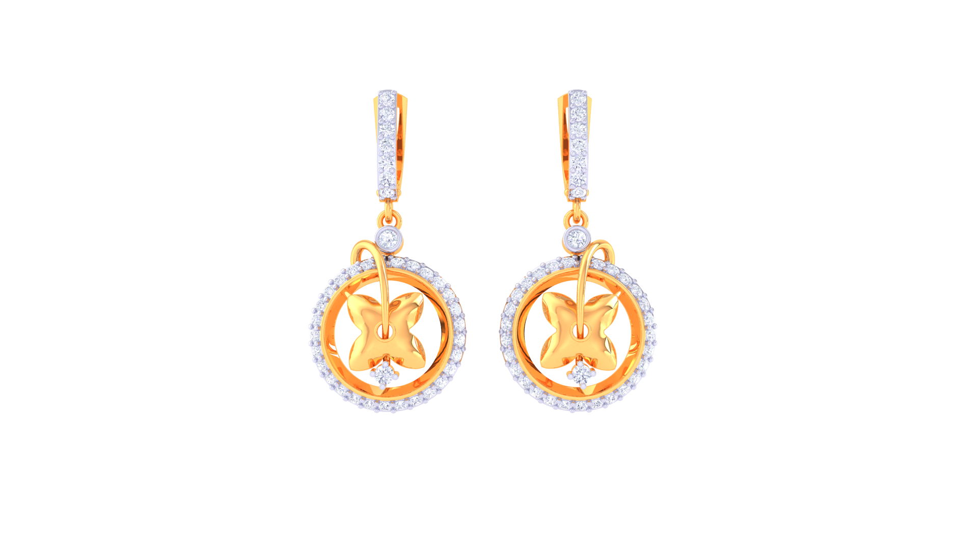 A radiant butterfly motif rests within a polished gold circle, encircled by a shimmering halo of 0.67 carats of white diamonds.