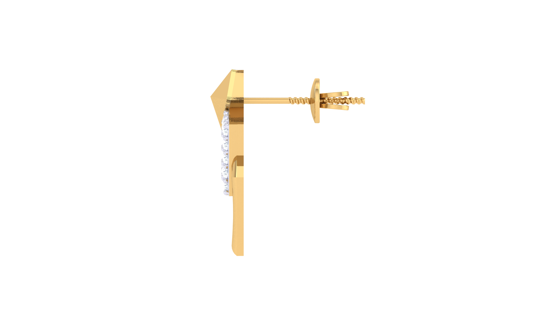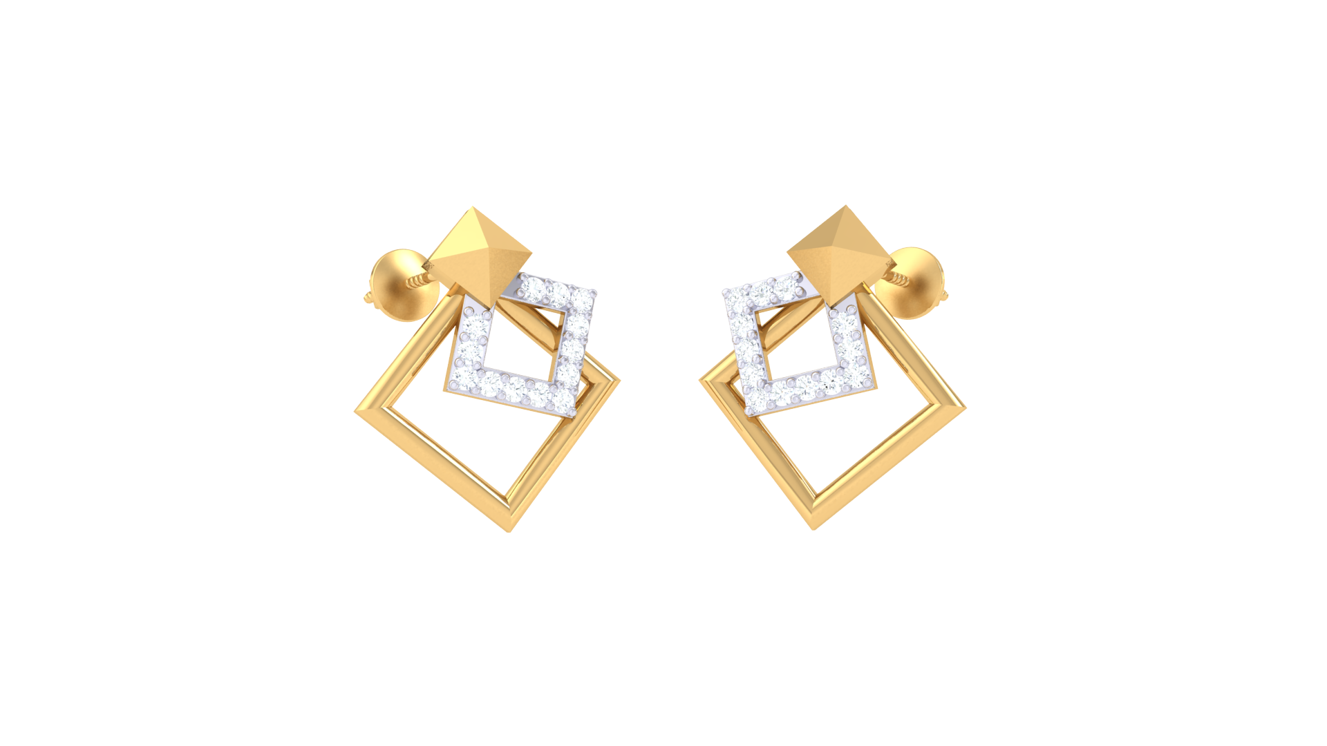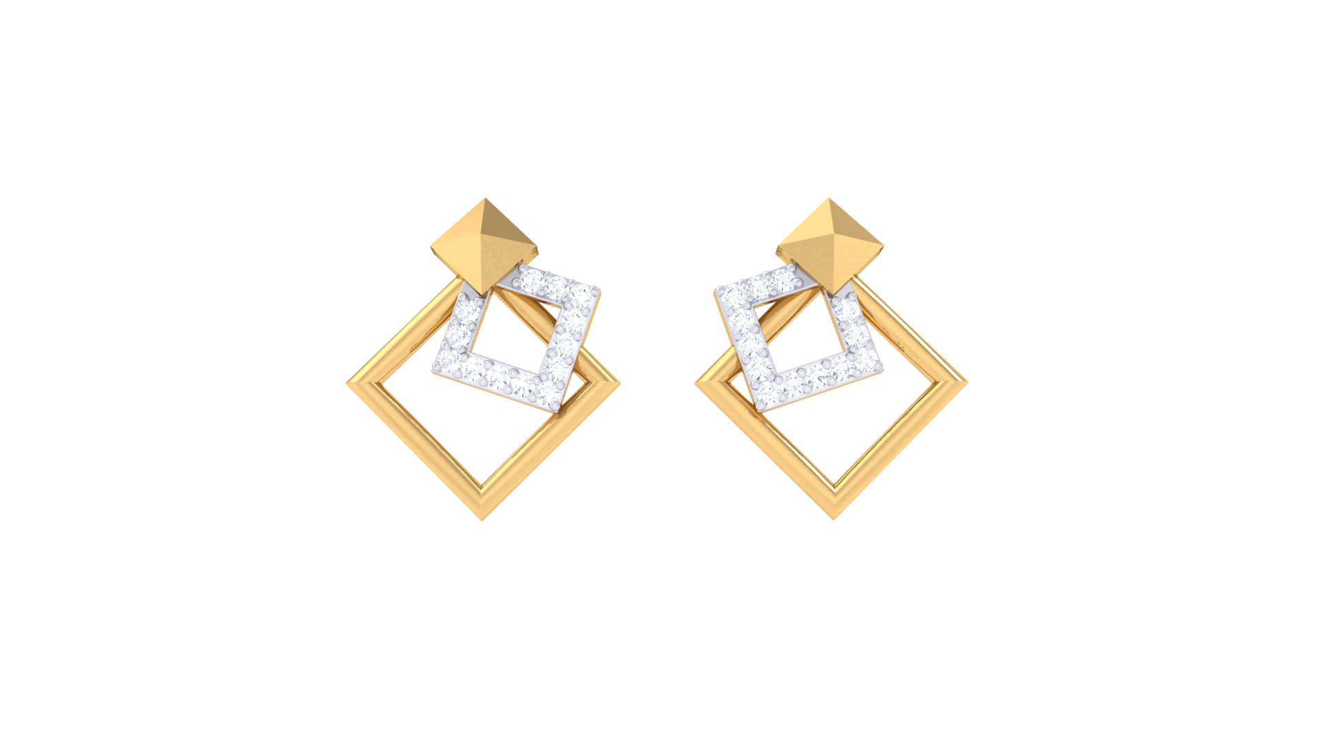 The design begins with a polished pyramid stud, leading to two interlocking rhombus frames—one shimmering with 0.13 carats of diamonds, the other in gleaming gold.