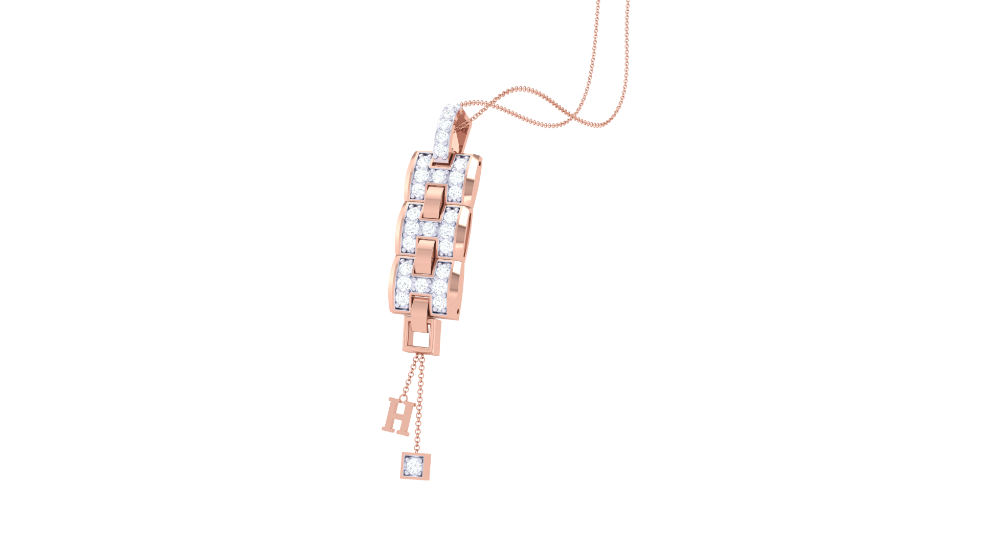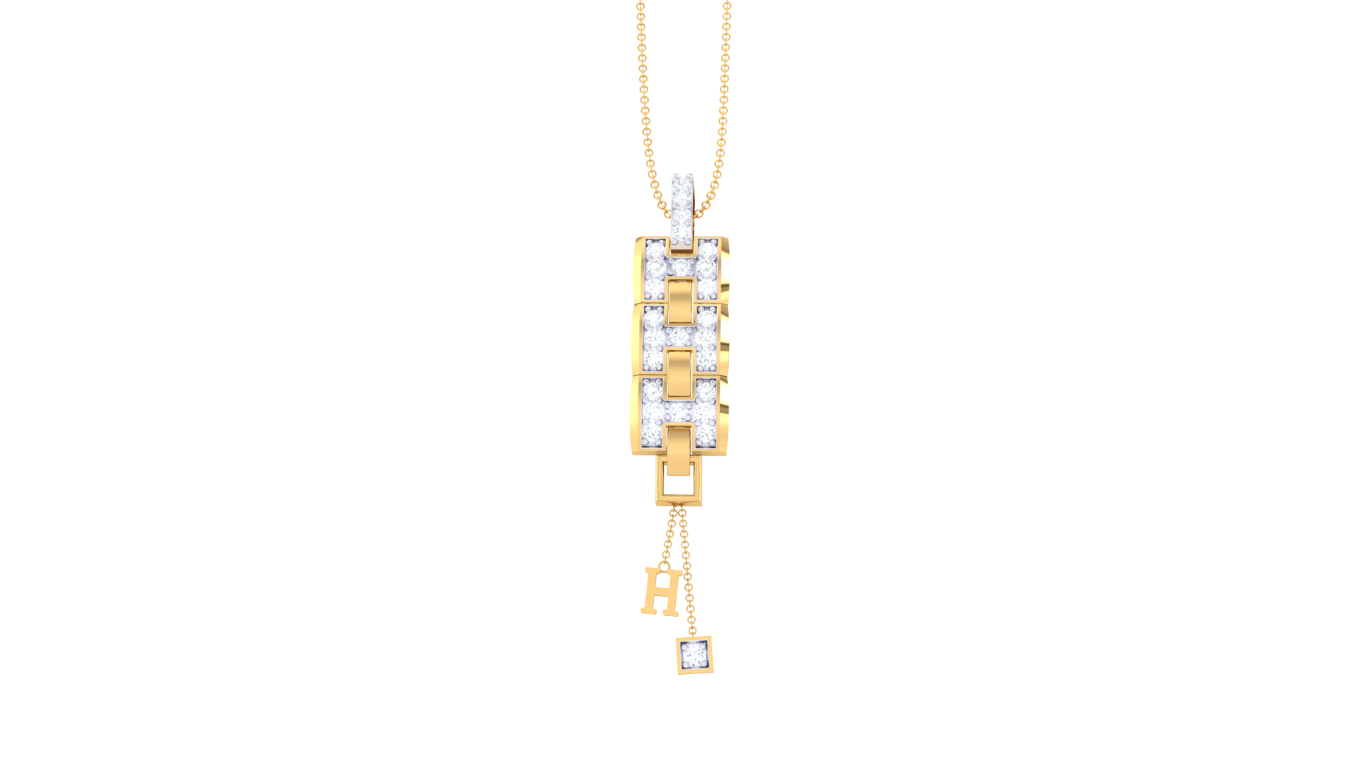Two symbolic charms—a diamond-accented square and a stylized “H”—add a playful yet refined finish to this modern statement piece.