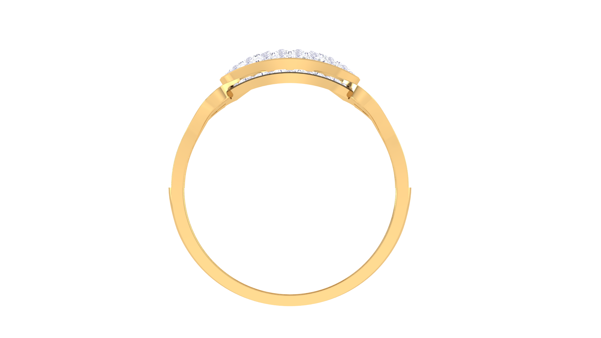 The split shank design flows into a curved golden bridge, connecting the two diamond-studded motifs in a dance of symmetry and sparkle.