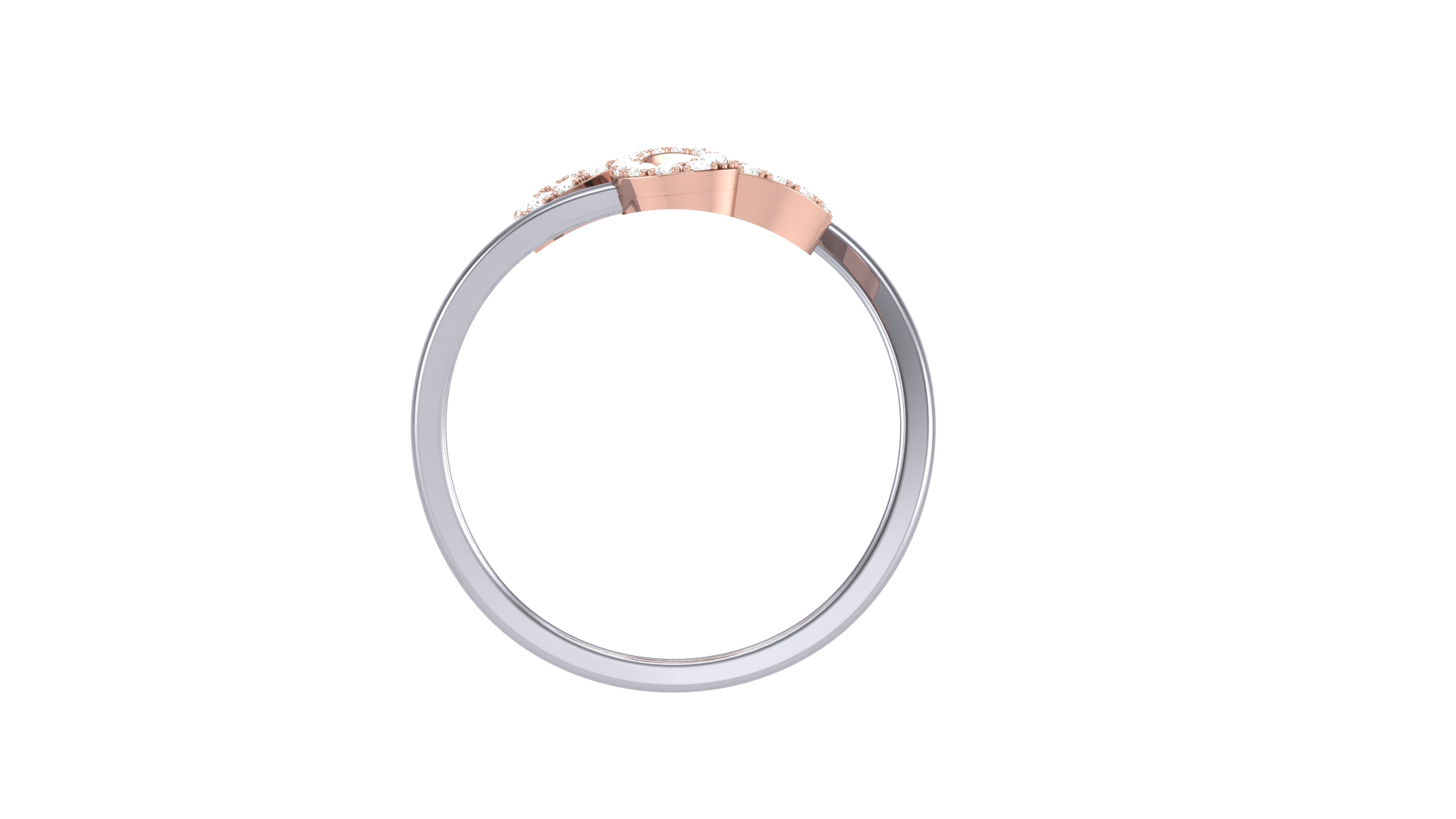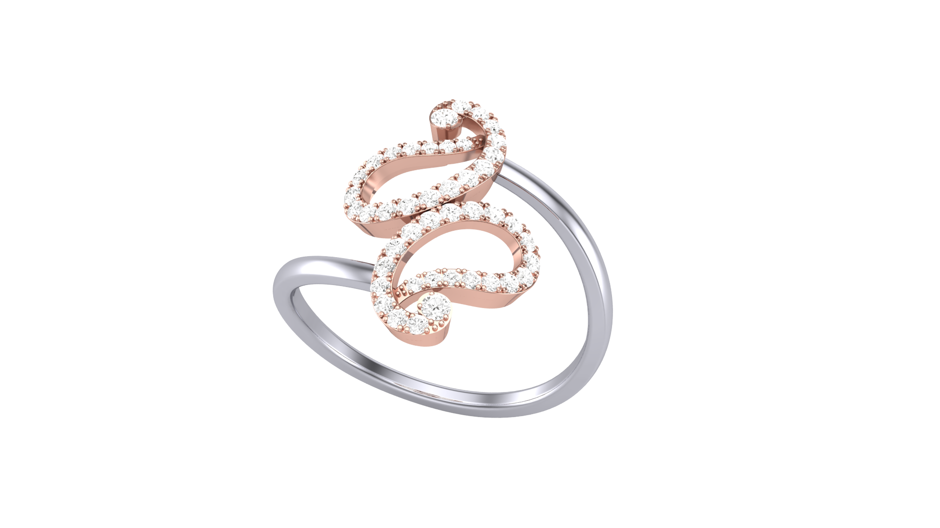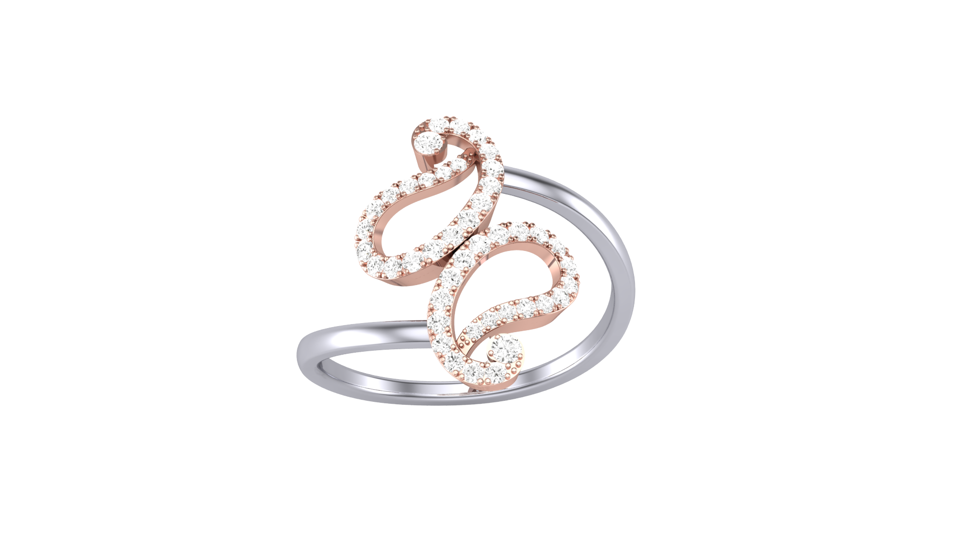 The sleek silver band gracefully splits into flowing curves, each adorned with rose gold accents that shimmer with 0.23 carats of brilliant-cut diamonds.