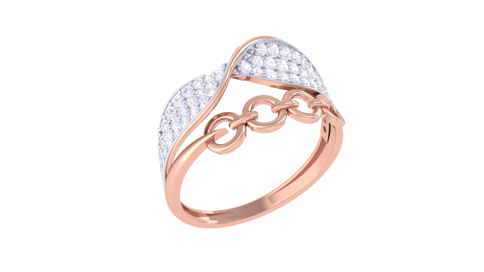 At its heart lies a chain-inspired motif—interlocking links that symbolize strength and connection—framed by two gracefully curved bands encrusted with 0.36 carats of brilliant diamonds.