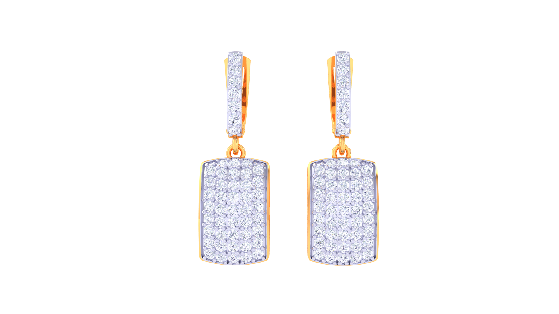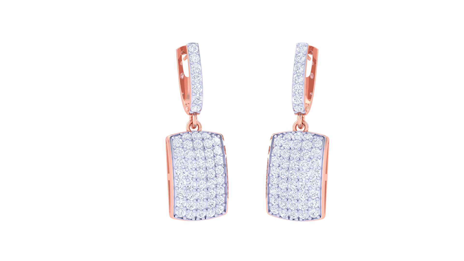 Each earring showcases a rectangular pendant encrusted with shimmering white diamonds totaling 0.85 carats, arranged in a pavé setting for maximum brilliance.