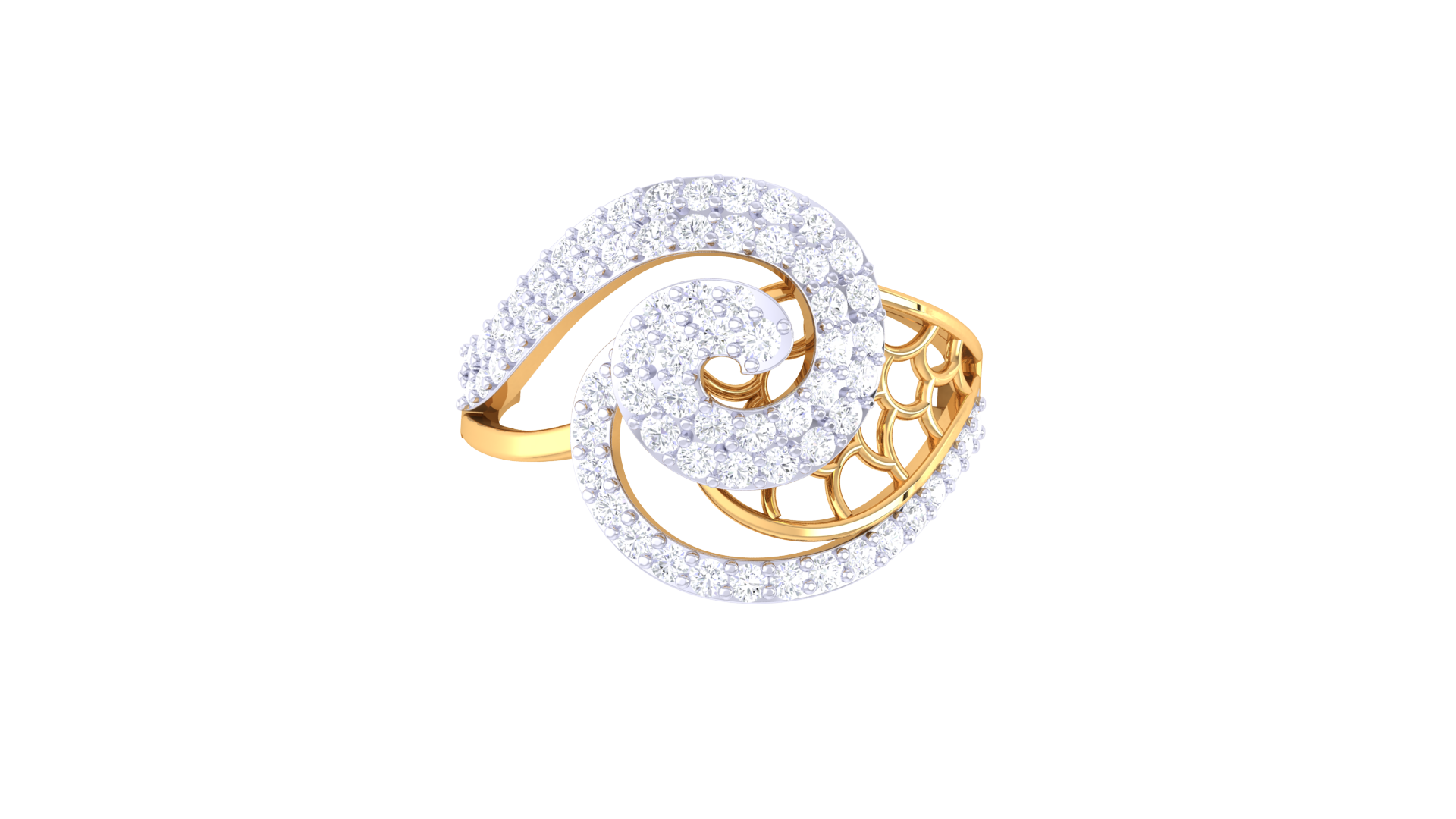 A teardrop-shaped filigree in yellow gold adds depth and contrast, framed by shimmering stones that elevate its ornate beauty.