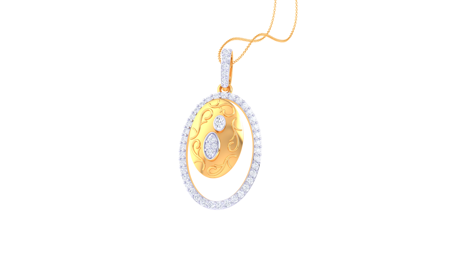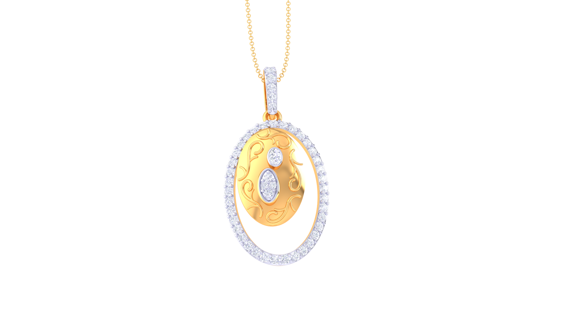 A timeless expression of elegance, this oval-shaped pendant is crafted in 1.68 grams of yellow gold, featuring intricate scrollwork that evokes vintage charm.