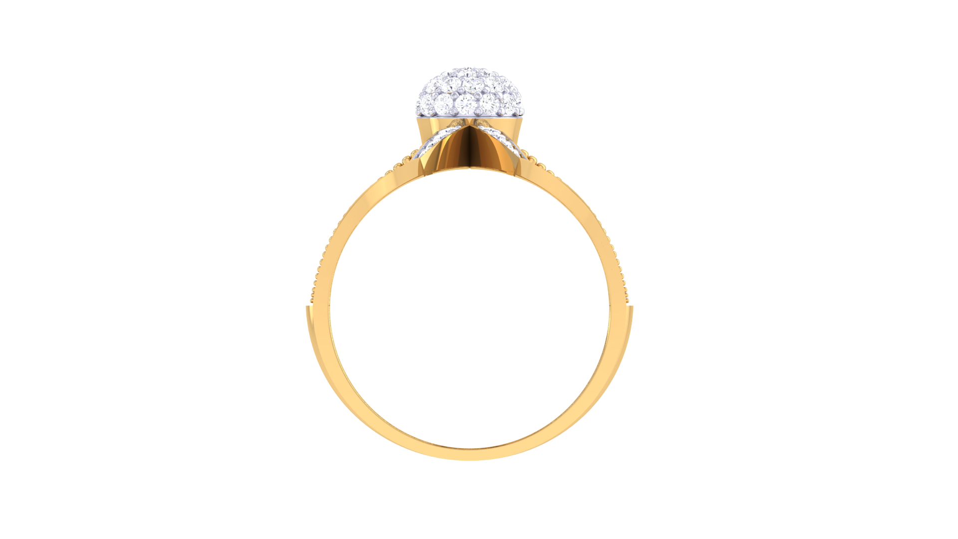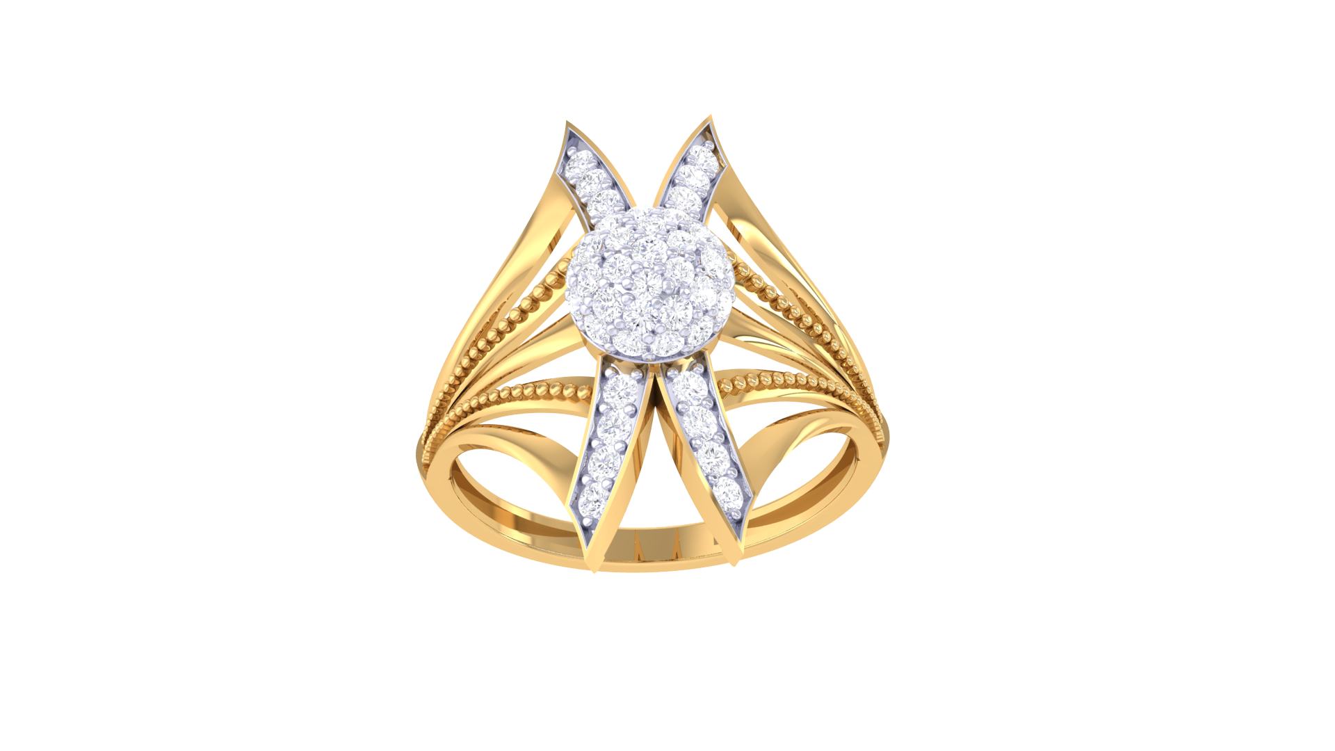 At its heart lies a circular cluster of diamonds totaling 0.41 carats, framed by two graceful V-shaped gold bands that converge in a striking embrace.