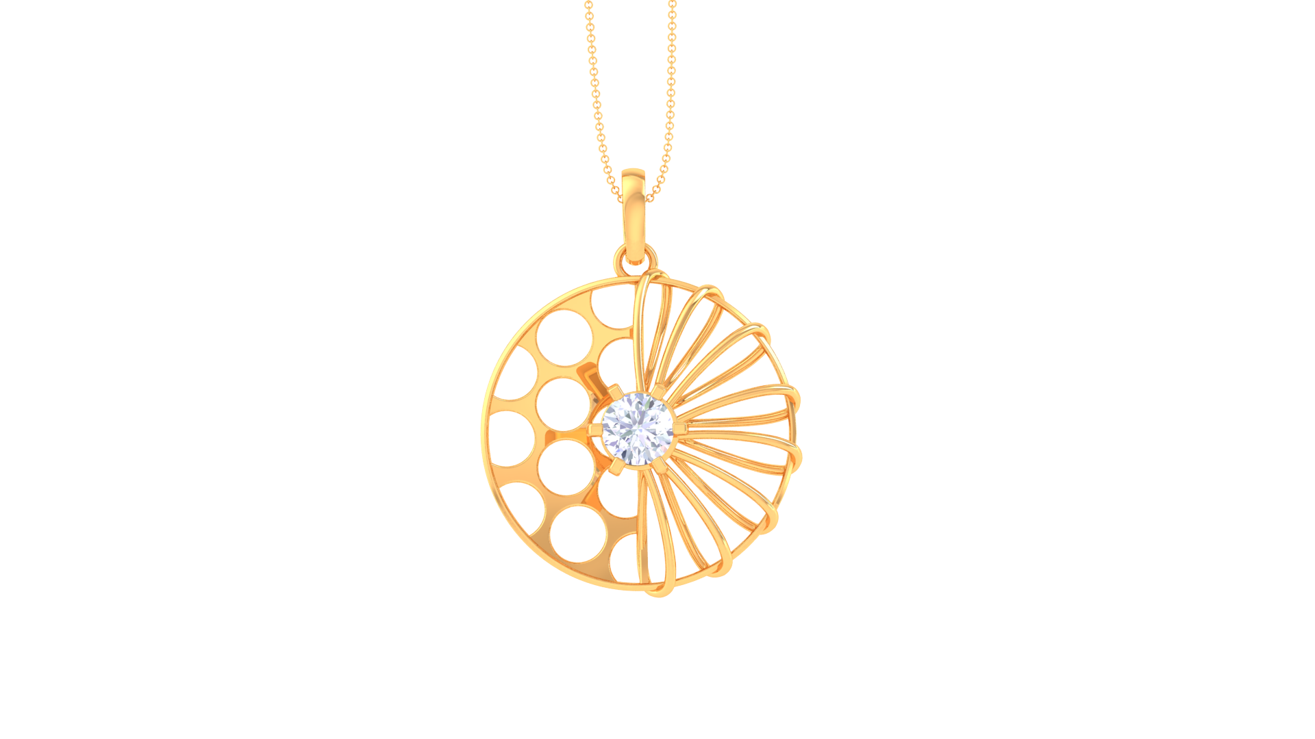 A captivating fusion of geometry and radiance, this 3.40-gram gold pendant showcases a bold circular silhouette divided into two striking halves—one adorned with delicate cutout circles, the other sculpted into sunburst spokes.
