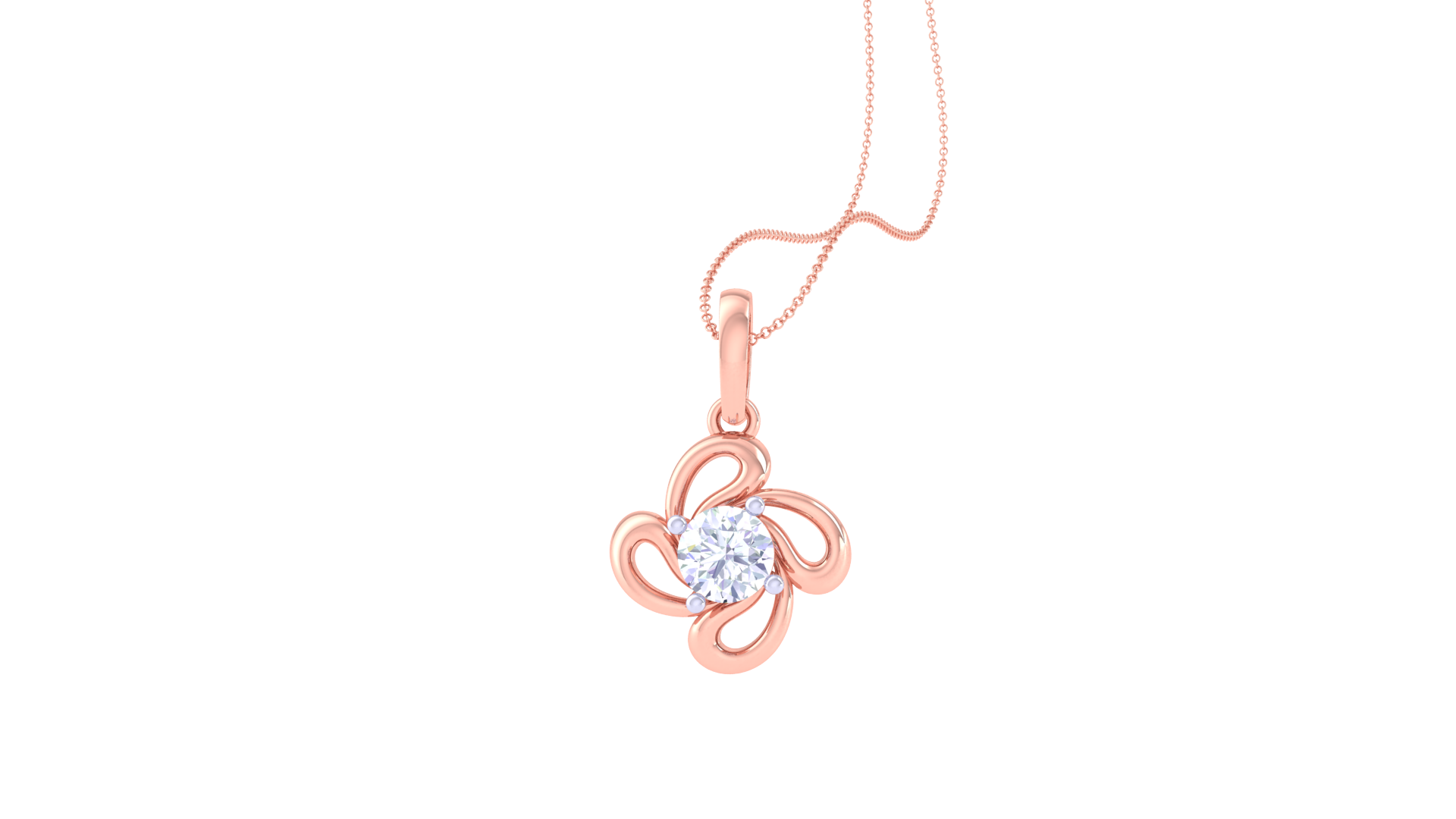 Crafted in 18K gold and weighing 1.72 grams, this pendant showcases a graceful floral silhouette with four petal-like loops encircling a brilliant 0.59 carat round diamond.