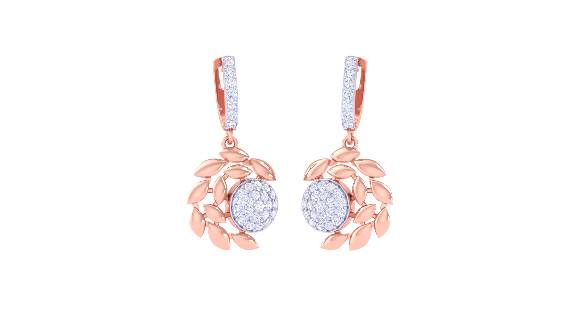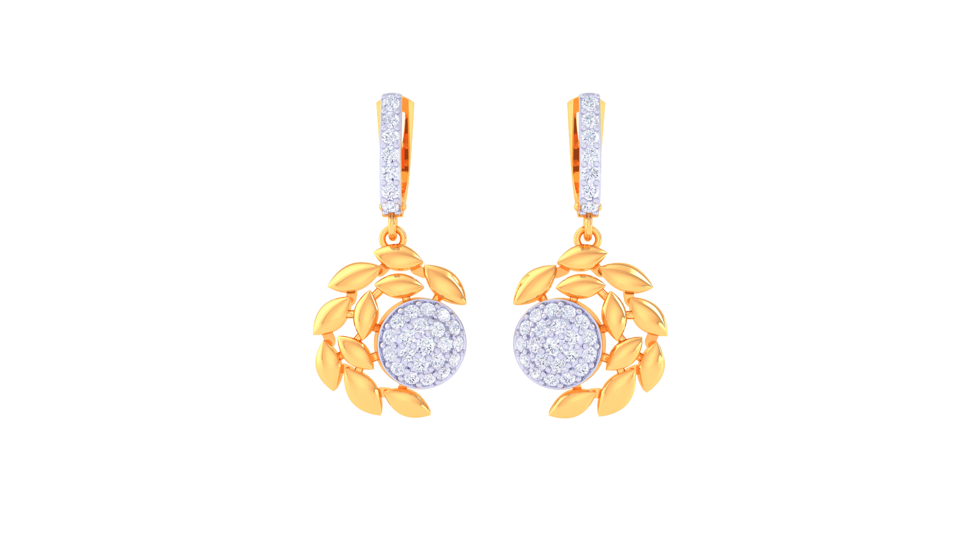 Each earring features a shimmering central disc encrusted with 0.51 carats of brilliant-cut diamonds, framed by a delicate arc of gold leaf motifs that evoke organic beauty and movement.