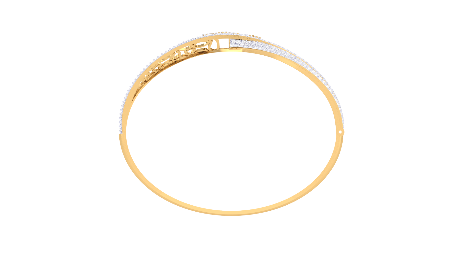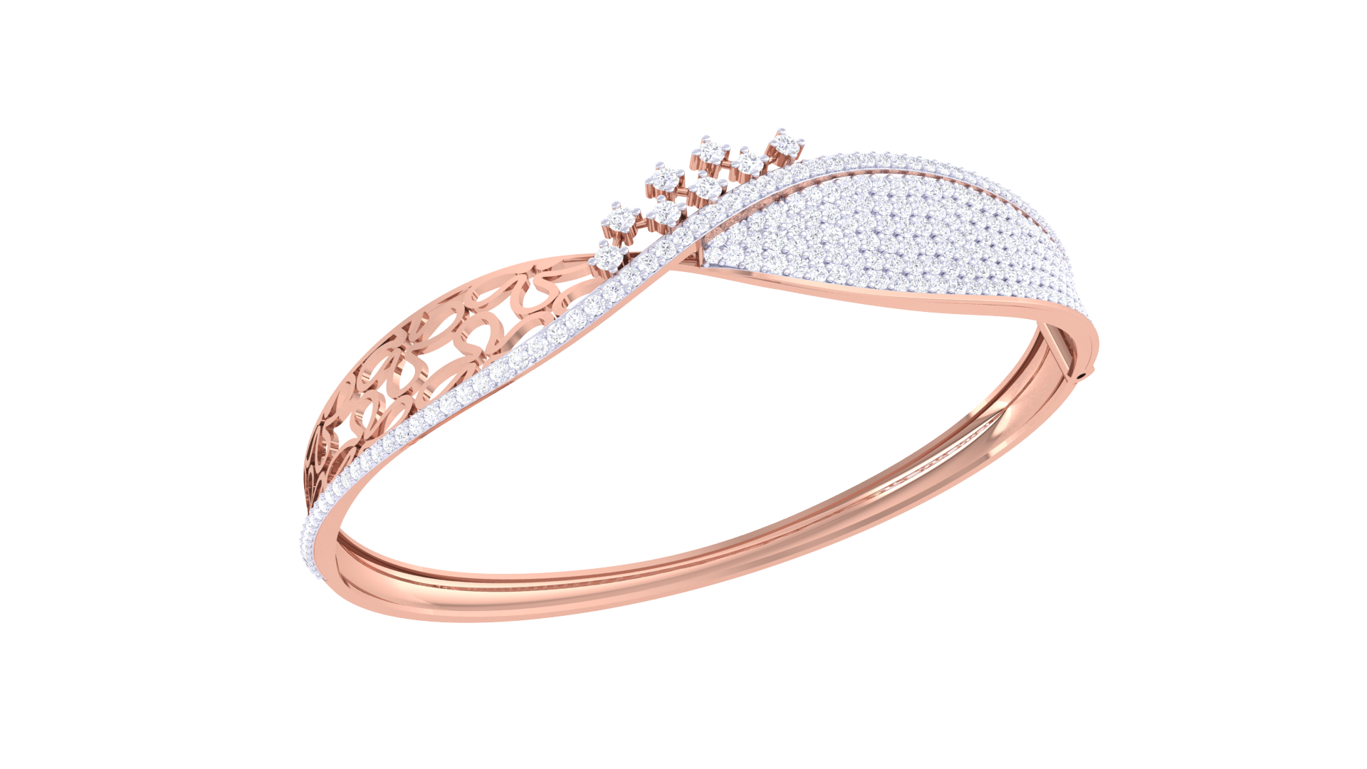 One half features a delicate floral lattice design, while the other dazzles with a dense arrangement of pavé-set diamonds totaling 1.70 carats.