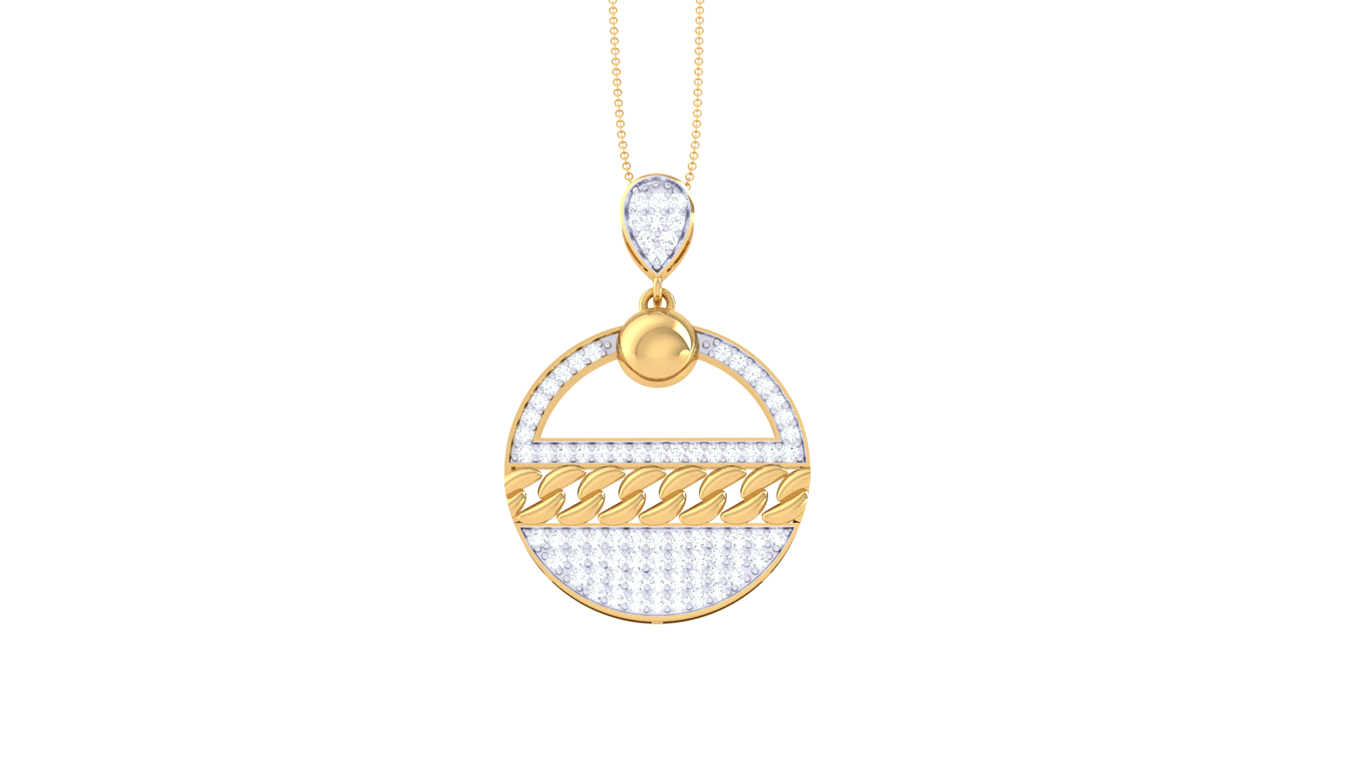 The pendant’s three-part composition features diamond-studded arcs above and below a central gold chain motif, blending brilliance with bold texture.