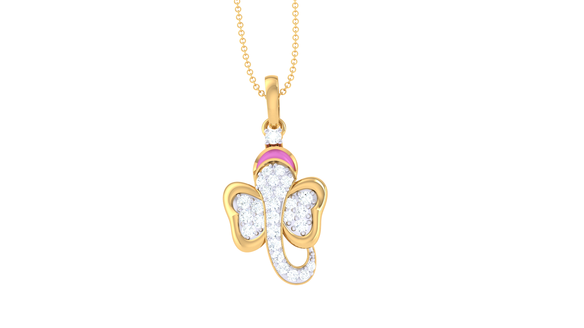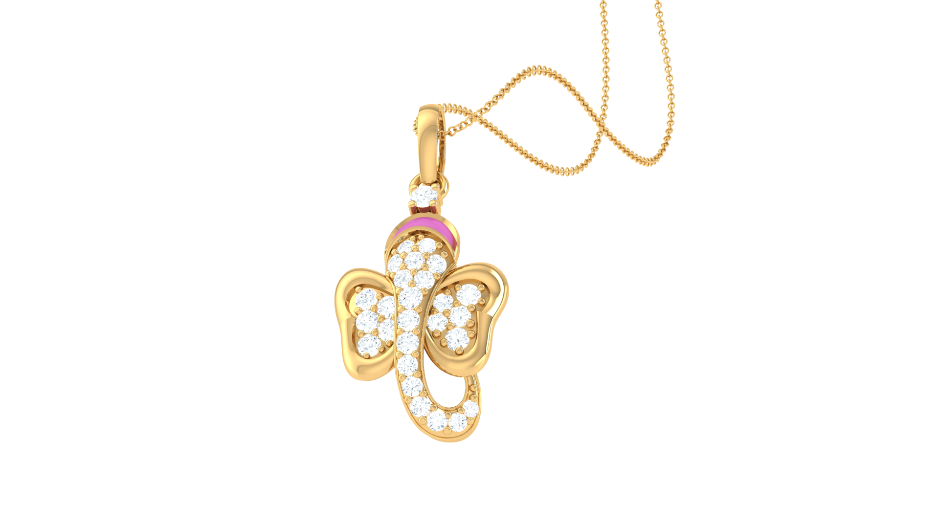 A symbol of wisdom and protection, the stylized elephant design is elevated by shimmering white stones and a delicate pink enamel accent.