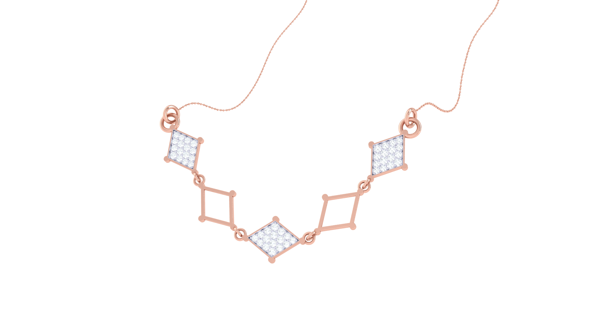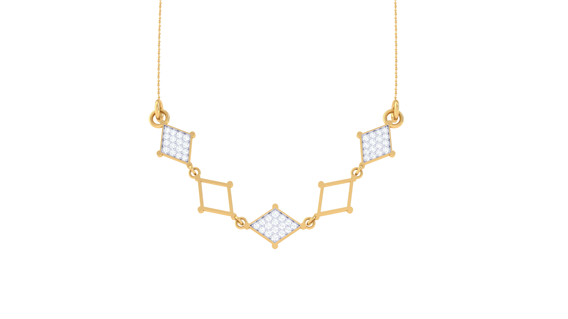 Crafted in 1.40 grams of radiant 18K yellow gold, this geometric necklace features five interlinked diamond-shaped motifs, each pavé-set with shimmering stones totaling 0.32 carats.