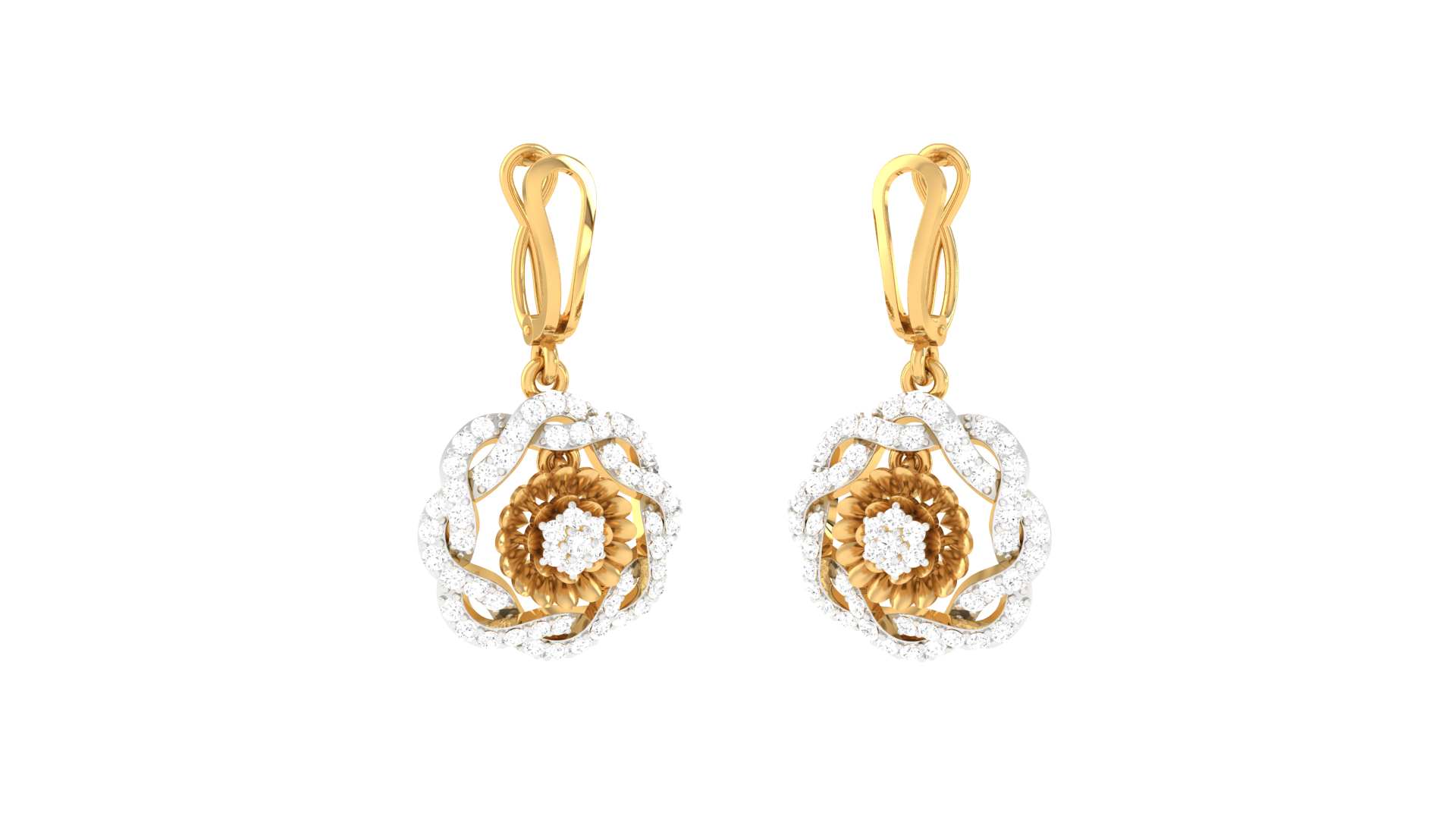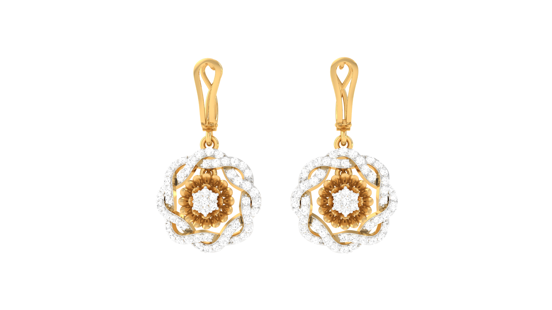 Dual Tone Floral Hoop Earrings In Gold - 0.78 Ct Round Diamonds