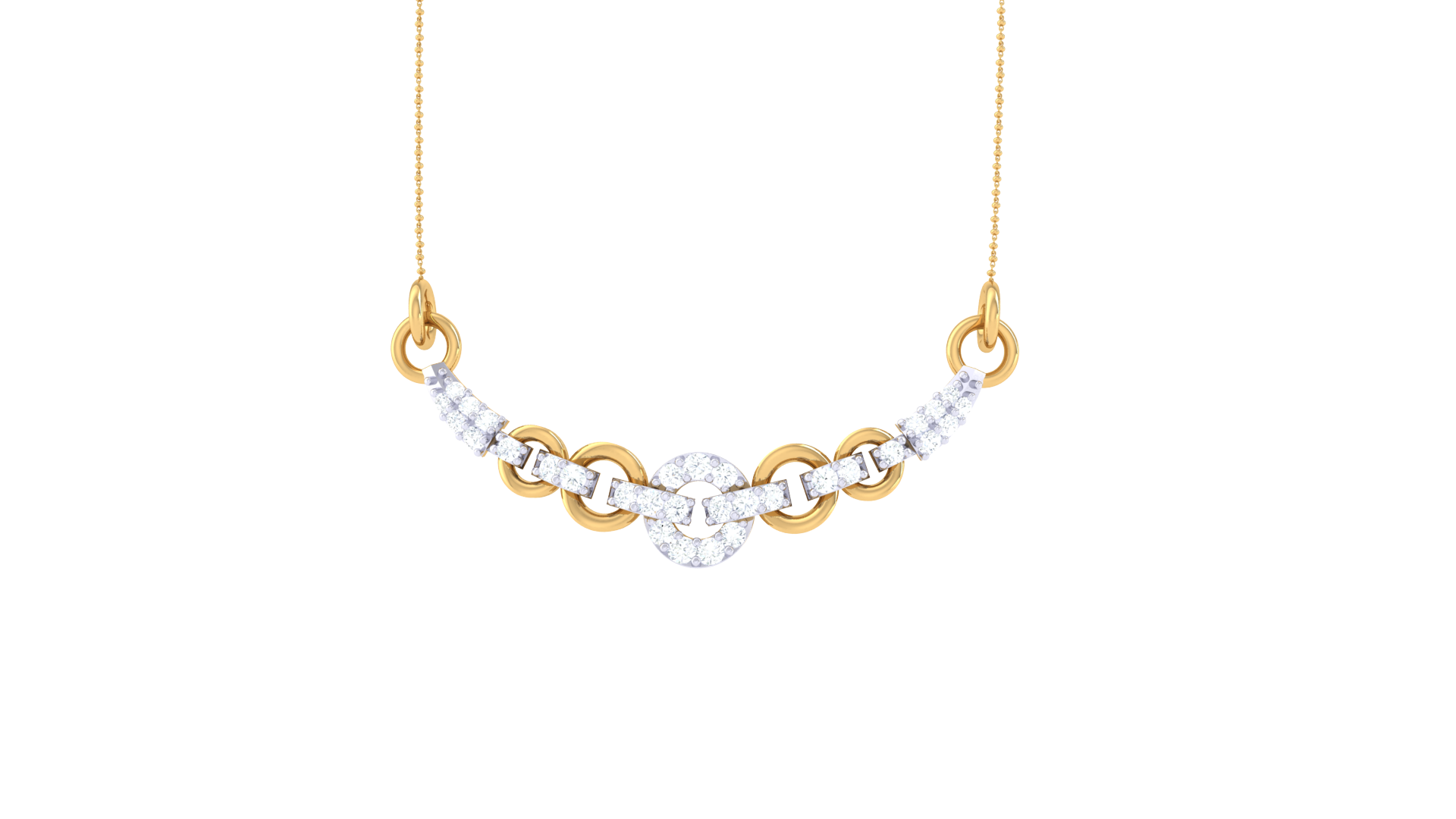 Expertly crafted in 2.23 grams of yellow gold, this necklace showcases a series of interlinked circular motifs, alternating between polished gold and pavé-set diamond accents.