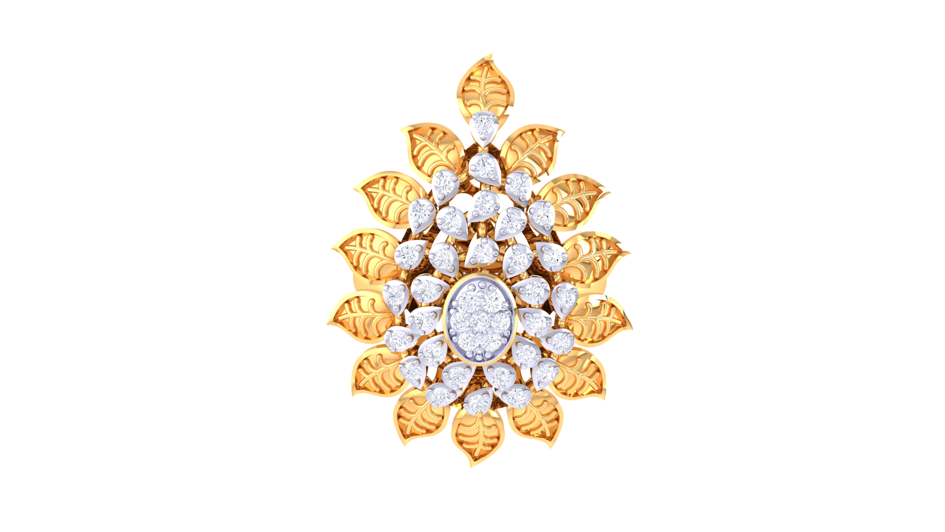 Intricately sculpted petal layers with leaf-vein detailing surround the centerpiece, blending traditional craftsmanship with luxurious sparkle.