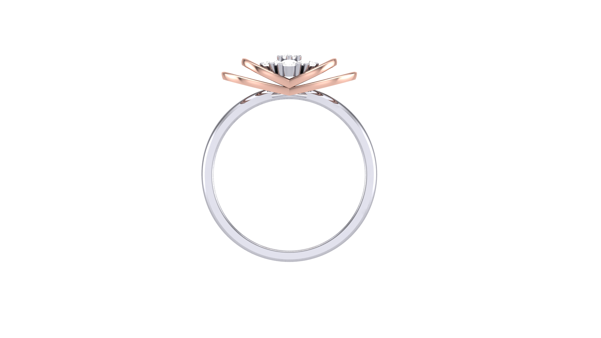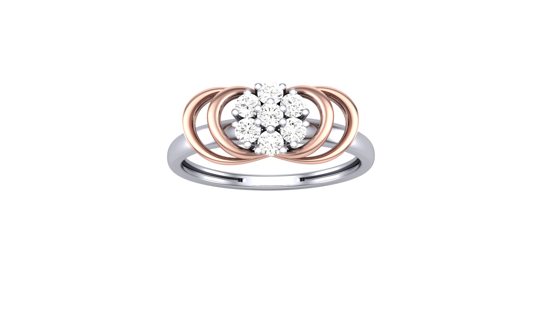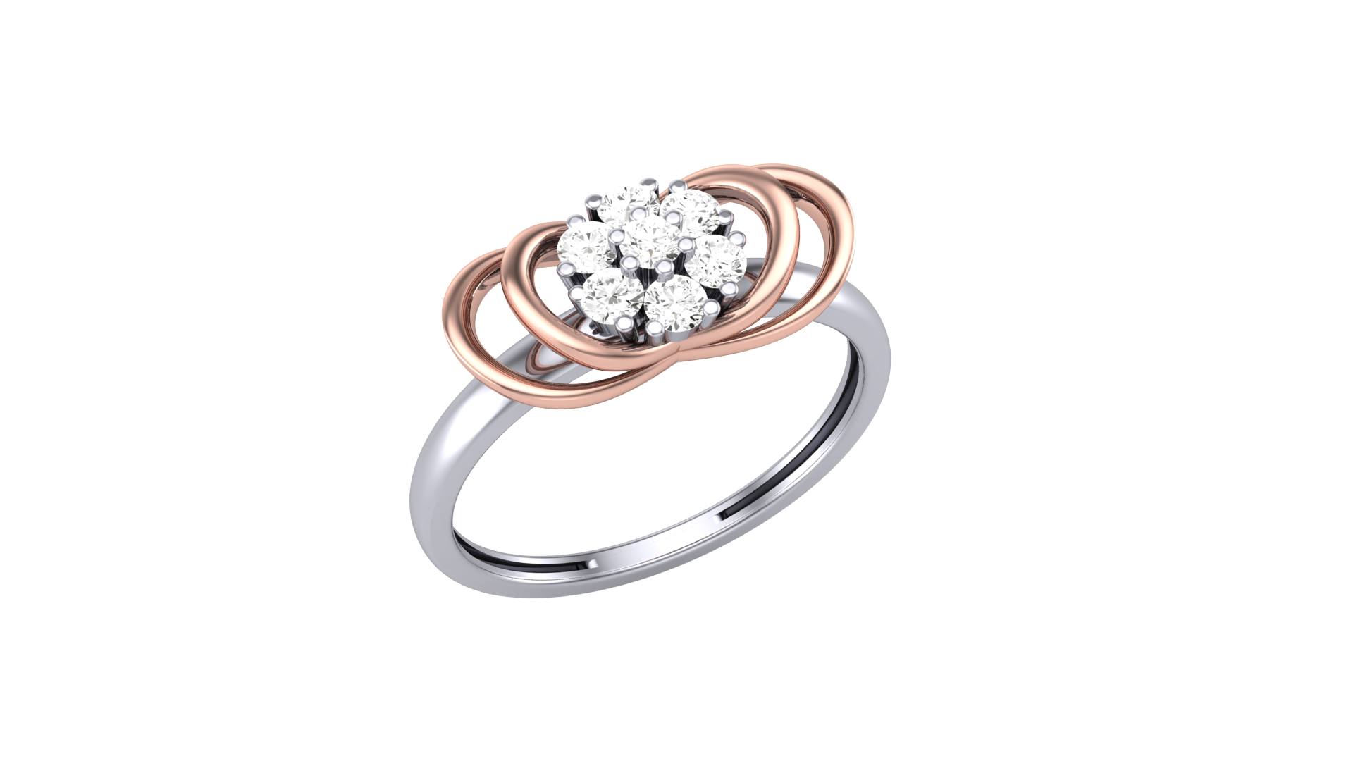 The rose gold loops form petal-like curves around the diamonds, creating a harmonious contrast that enhances the ring’s sculptural beauty.