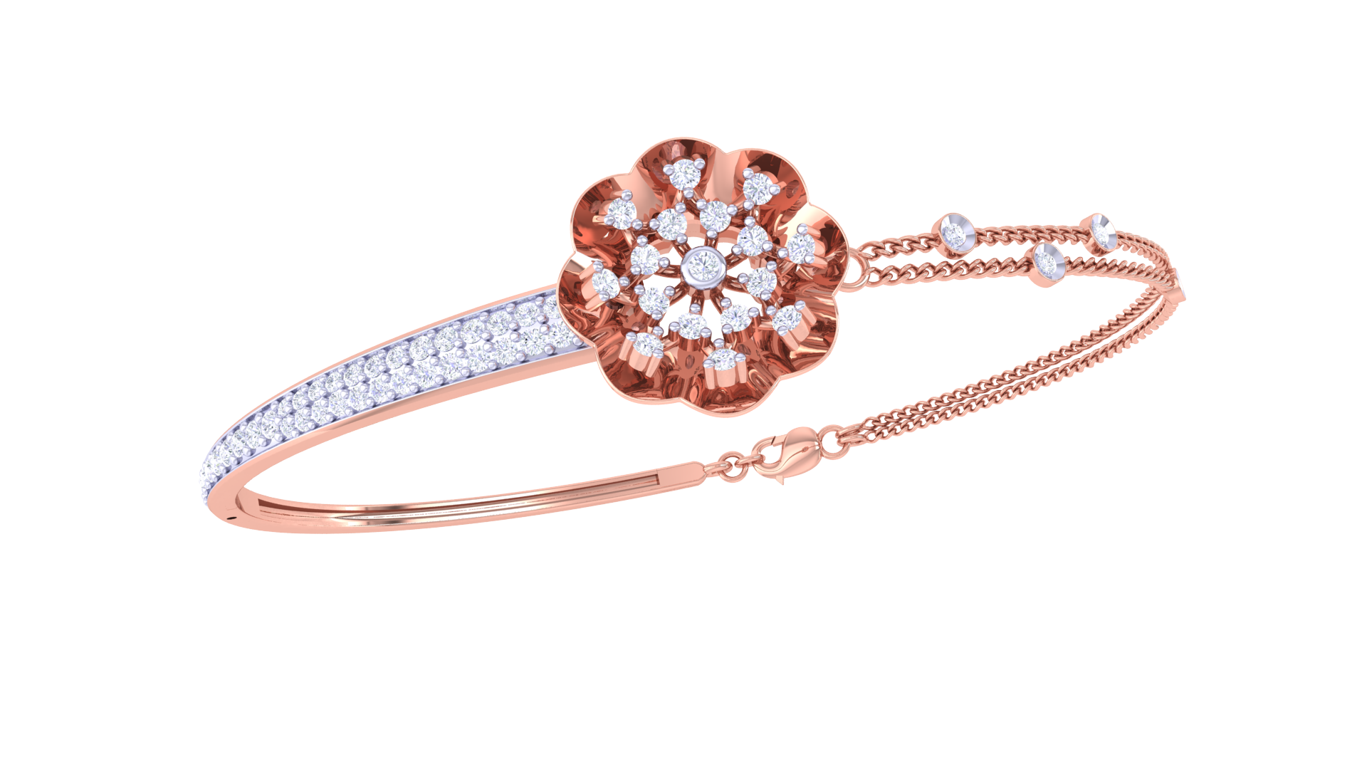 A radiant flower takes center stage, its petals encrusted with 0.52 carats of sparkling diamonds that shimmer with every movement.