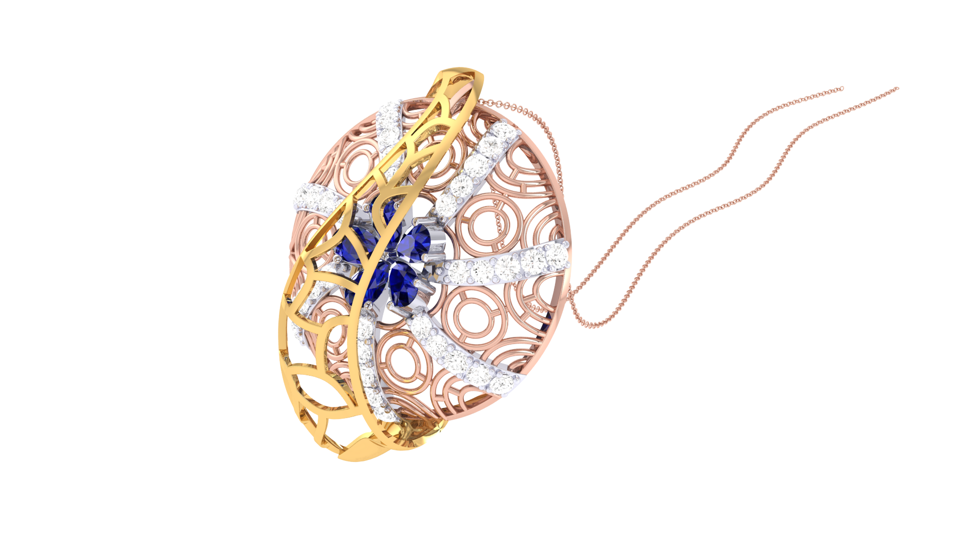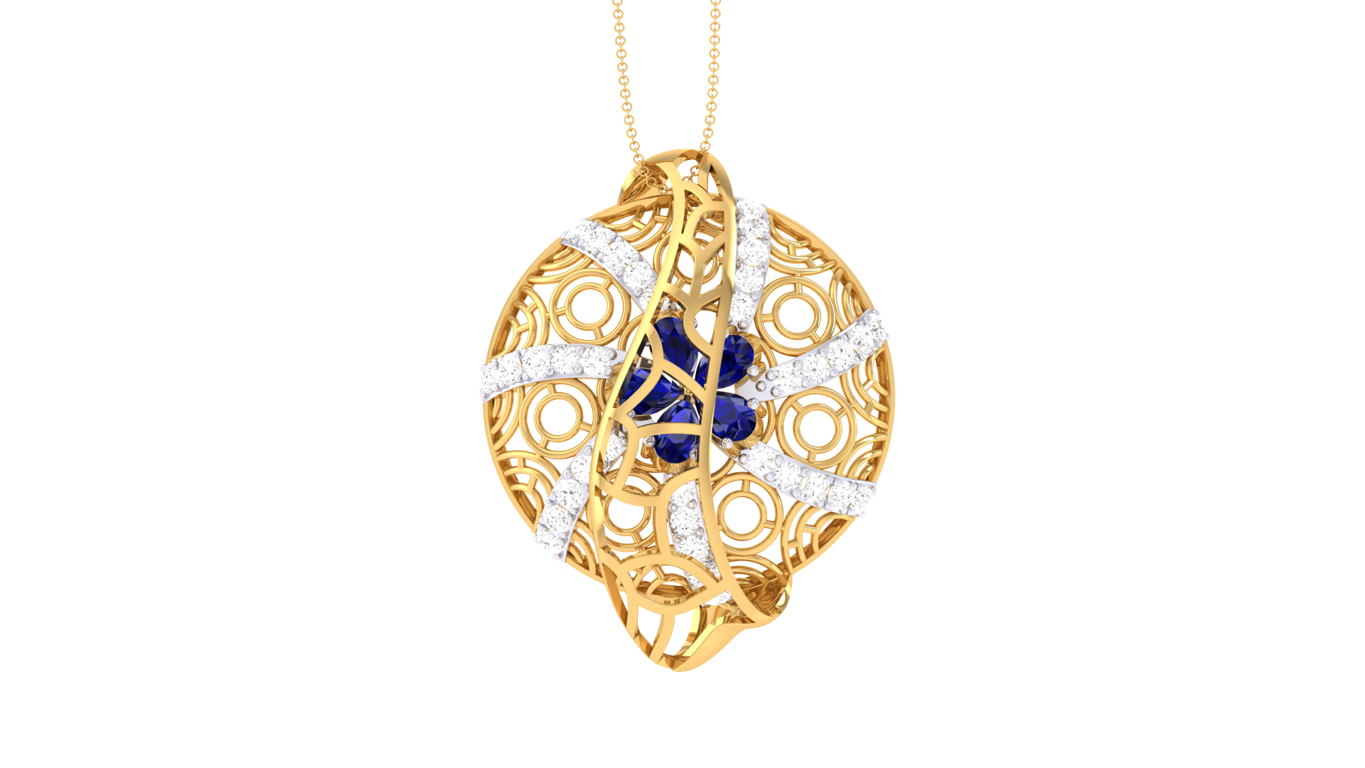 Ornate Filigree Pendant In Gold - 0.41 Ct Diamonds and Blue Gem Cluster