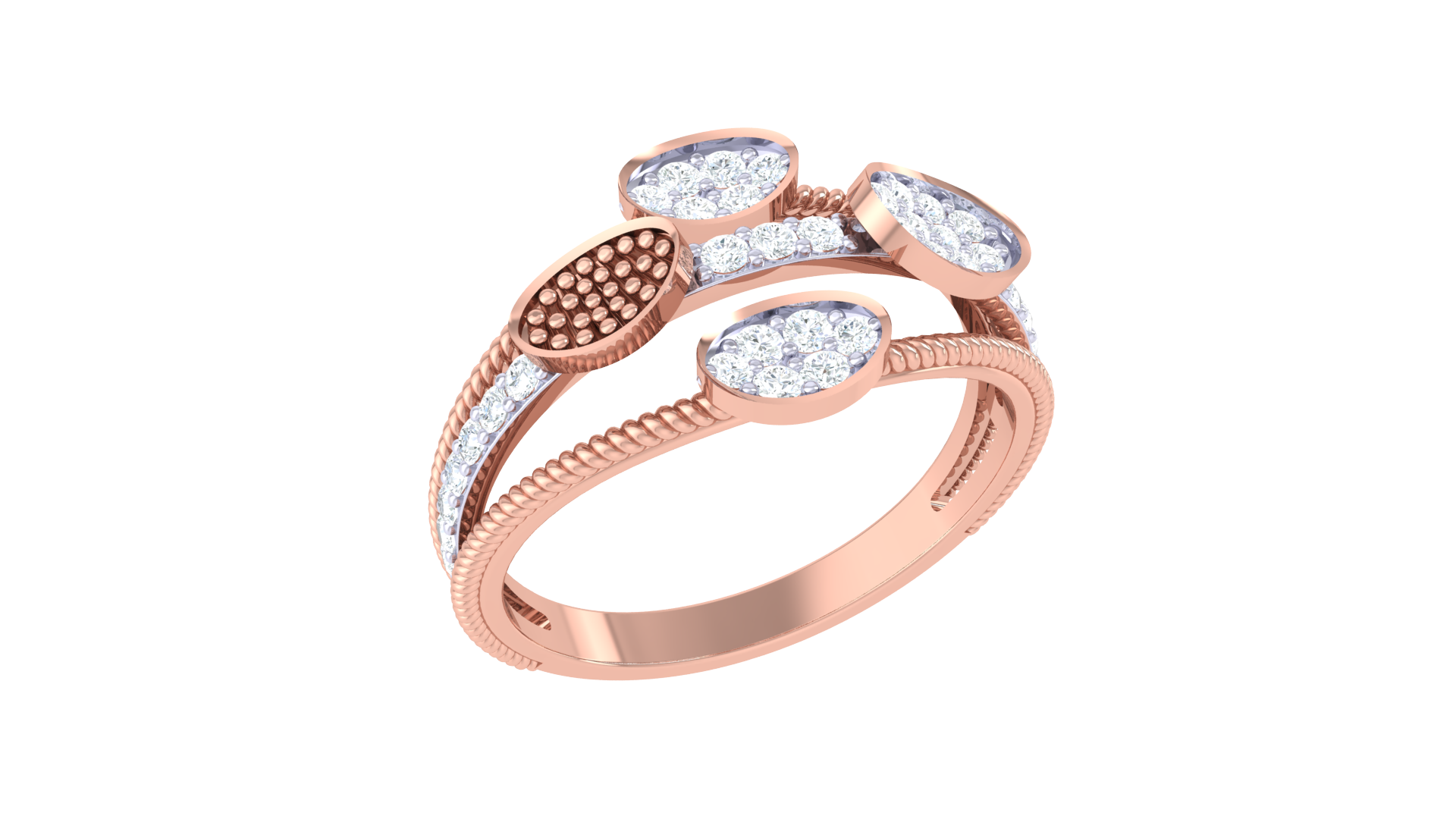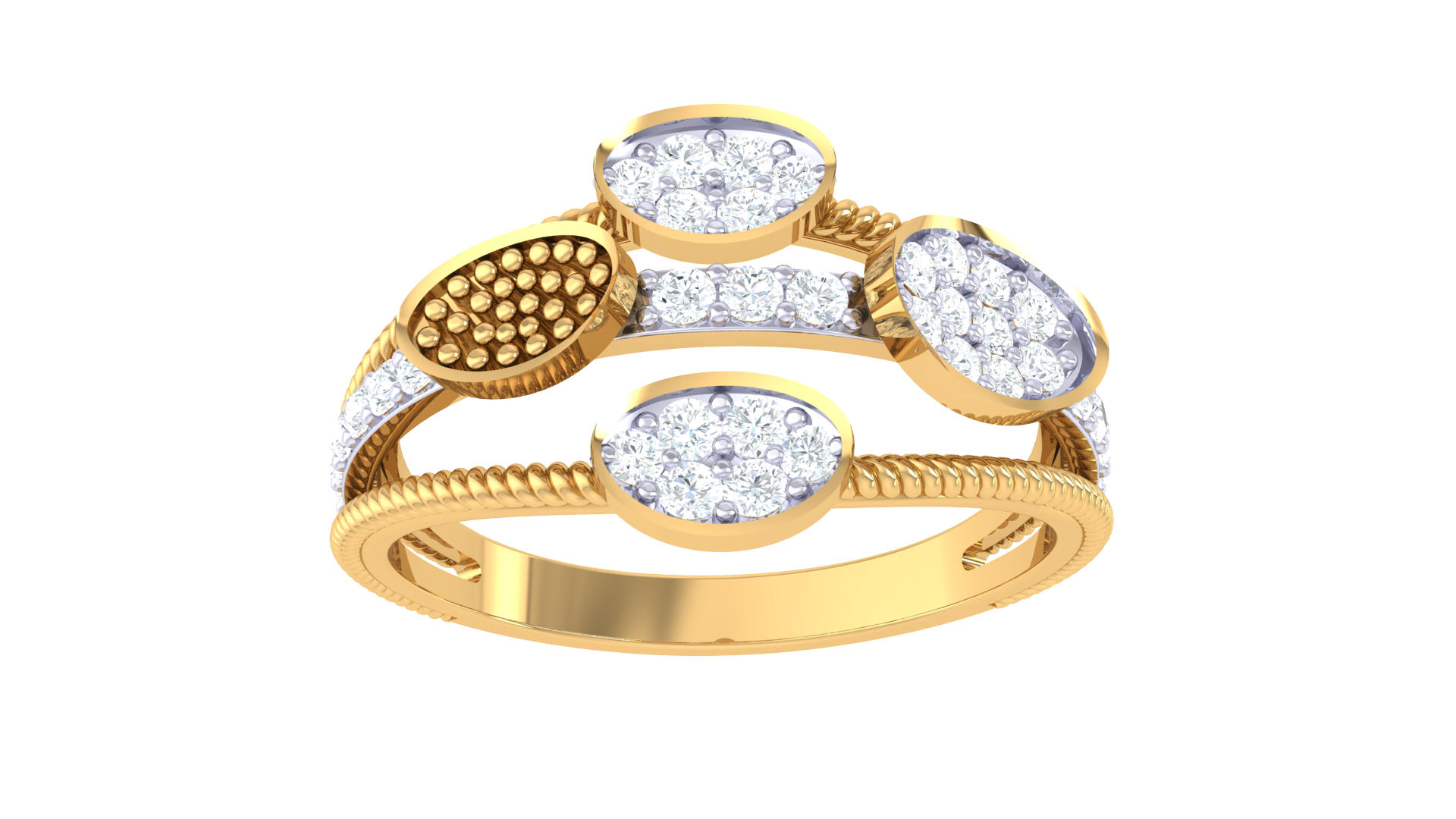 Crafted in 18K gold with a total weight of 2.65 grams, this avant-garde ring features a striking arrangement of five circular motifs—four adorned with 0.27 carats of shimmering diamonds, and one with a textured gold finish that adds artistic contrast.