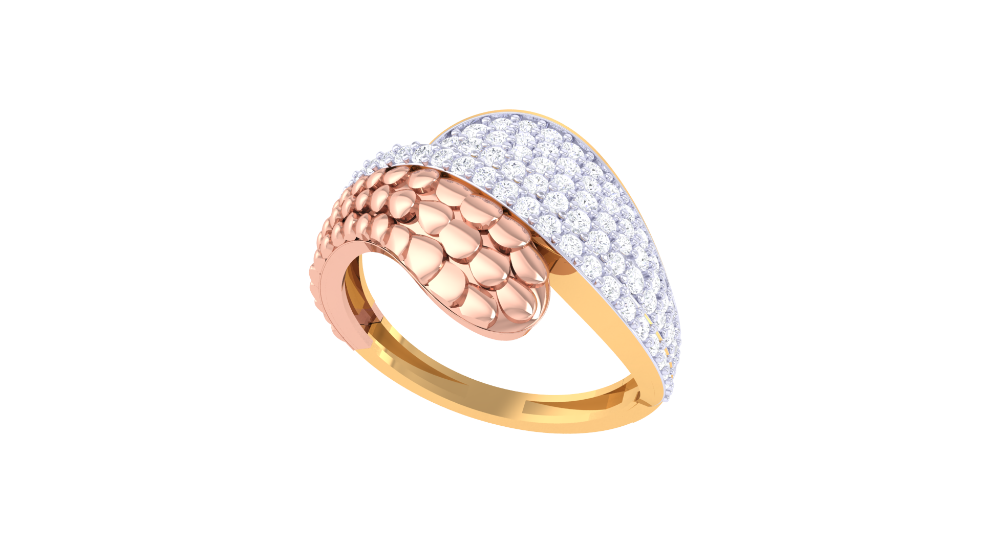 Cast in 3.68 grams of 14K rose and yellow gold, its asymmetrical silhouette features a bold interplay of finishes—one side gleams with a scale-textured rose gold surface, while the other dazzles with 0.53 carats of pavé-set diamonds, creating a radiant arc of light.