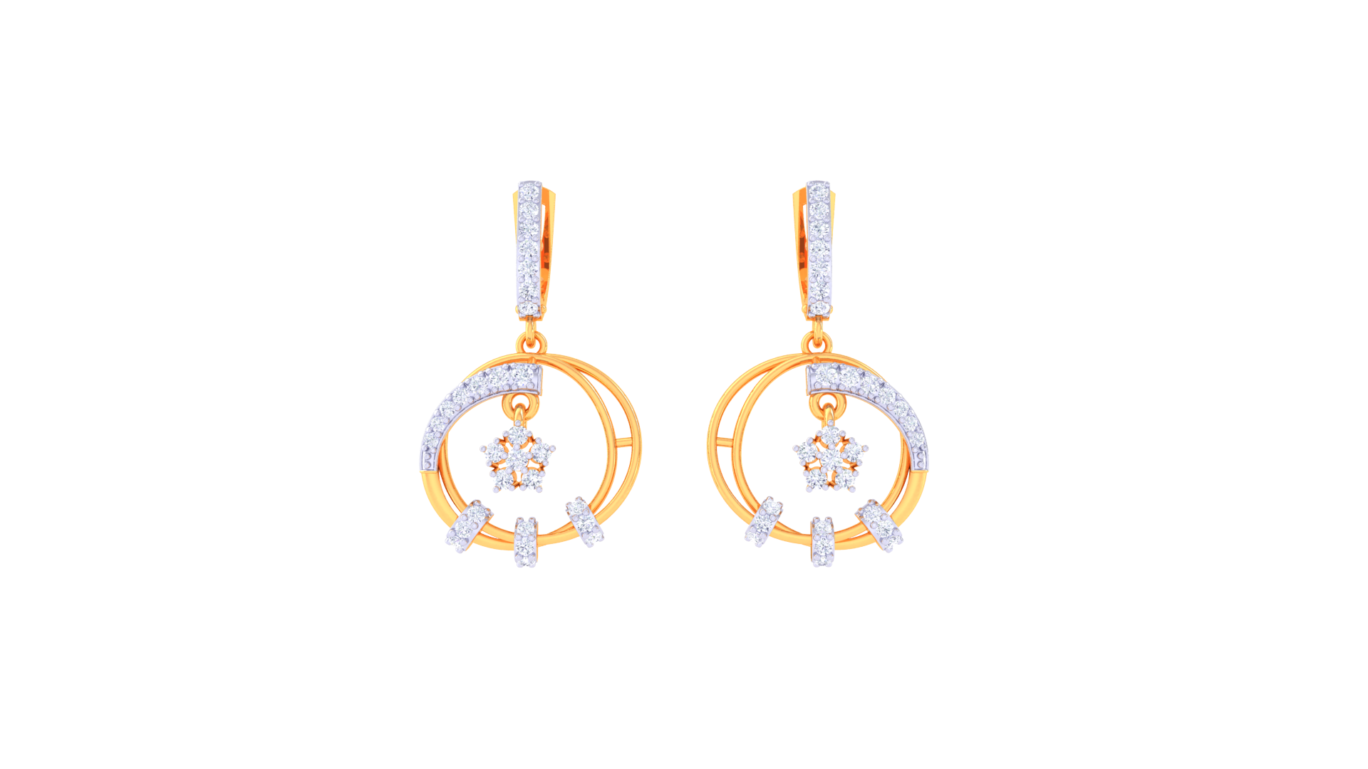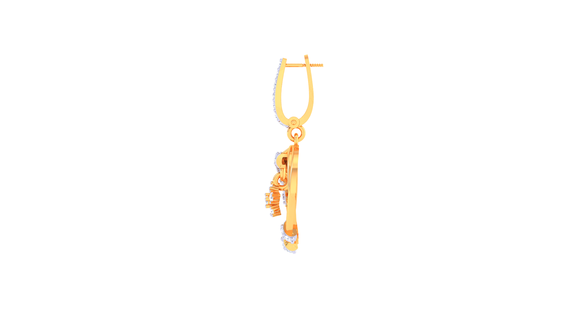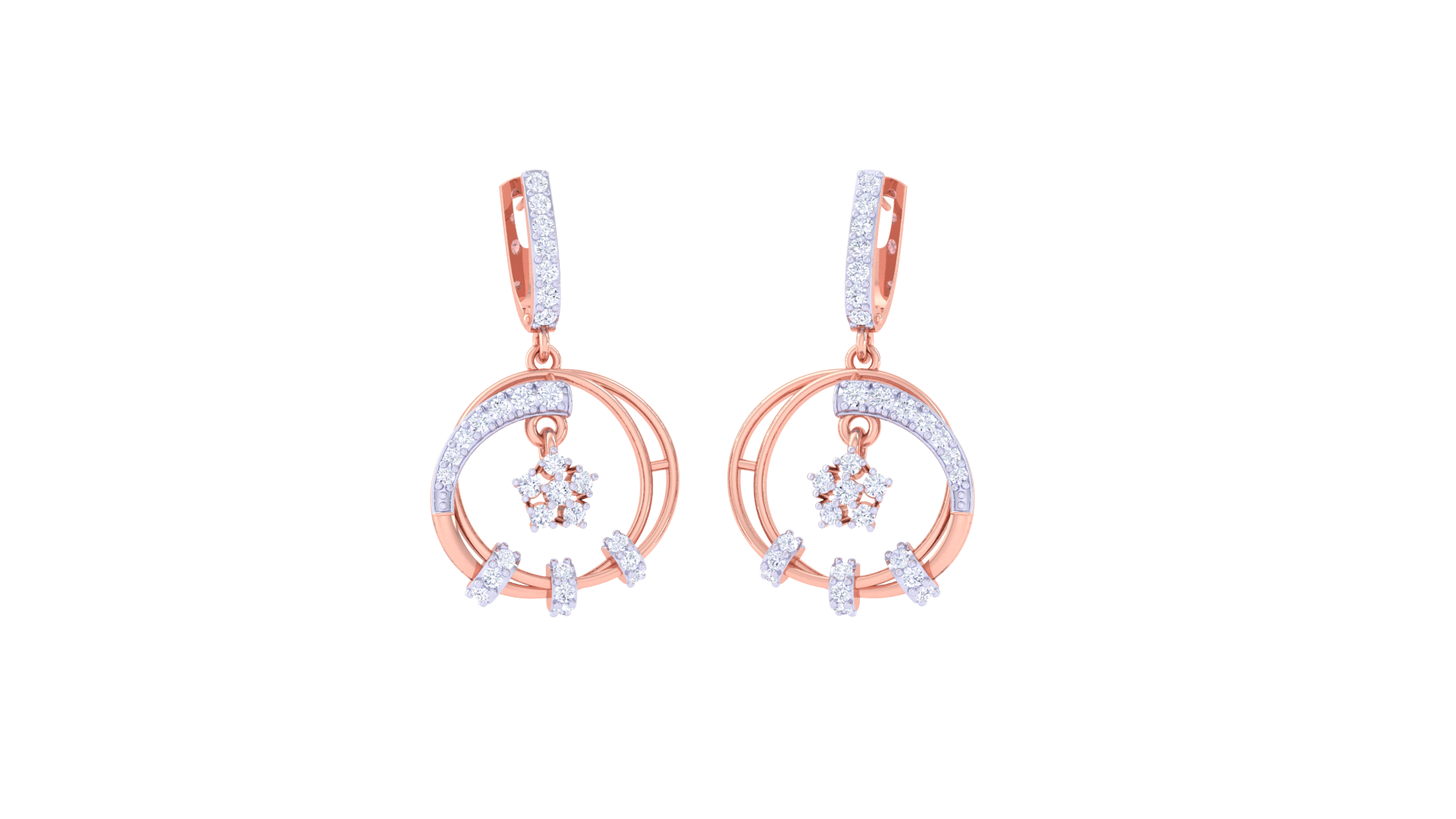 A vertical bar of pavé-set stones leads gracefully into a floral-inspired diamond cluster suspended at the center, adding depth and movement to the composition.