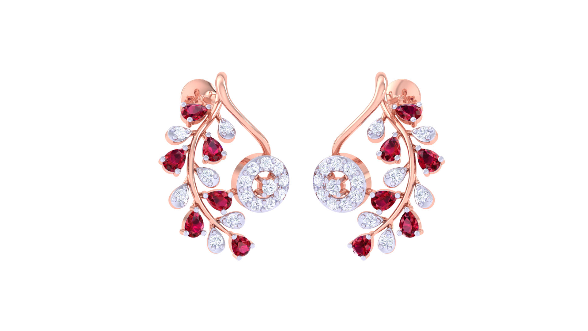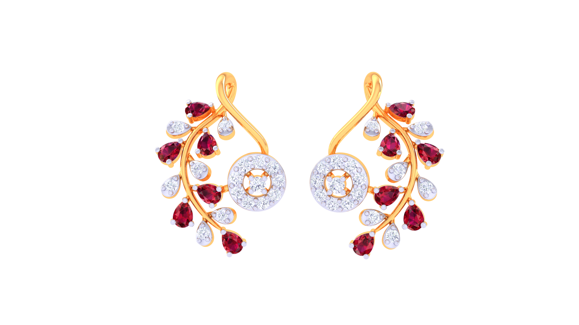 Floral Cascade Golden Stud Earrings - 0.62 Ct Sparkling Diamond & Ruby Drops
