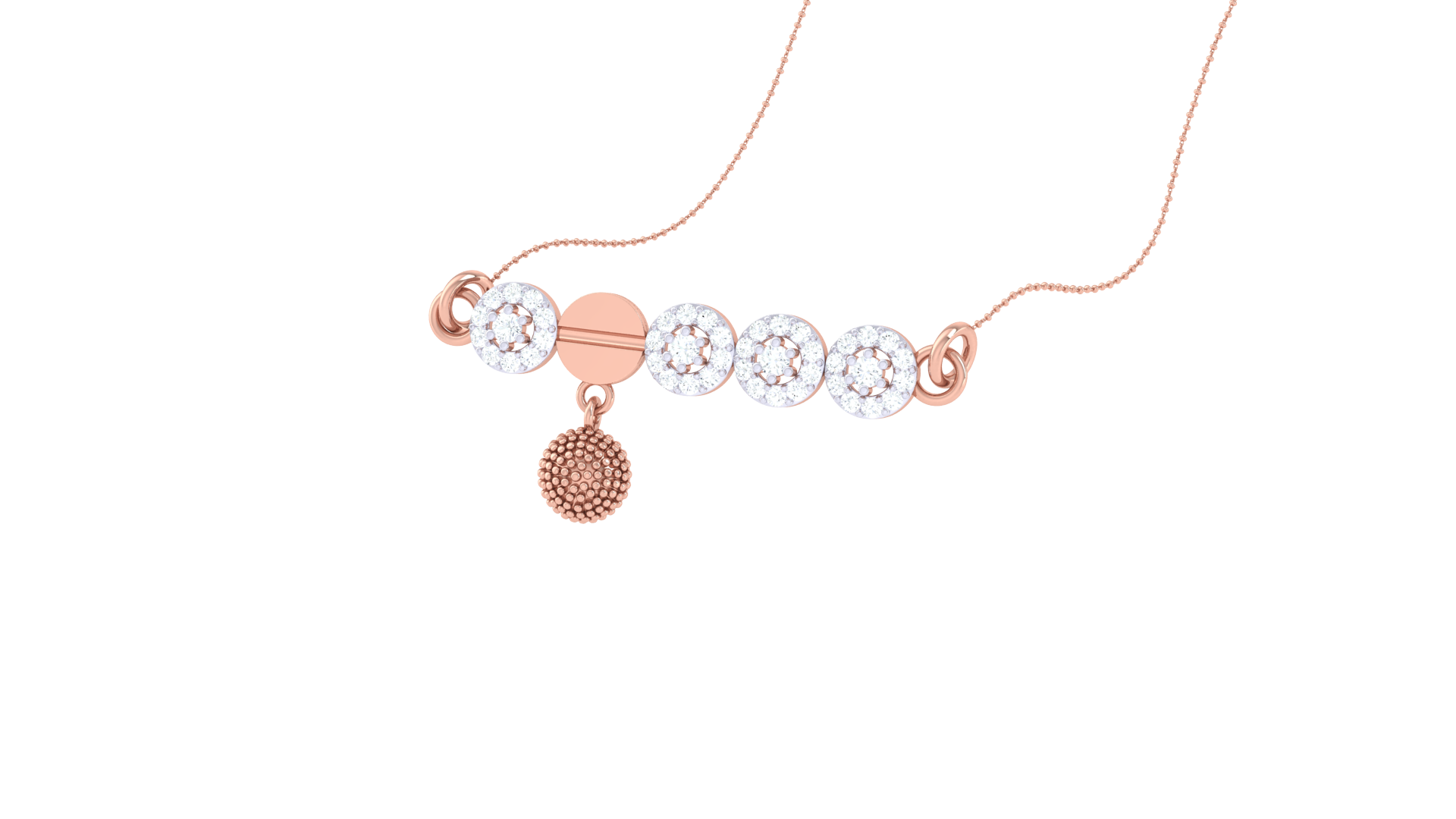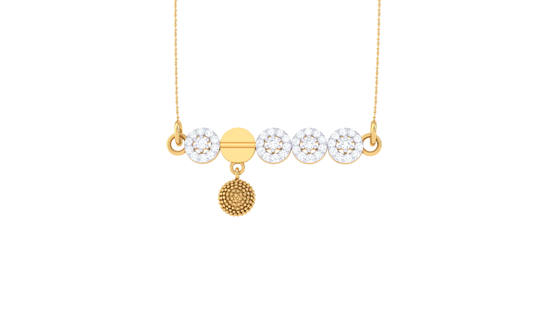 This modern yet graceful necklace features five aligned circular elements—four pavé-set with 0.40 carats of diamonds and one polished gold disc at the center.