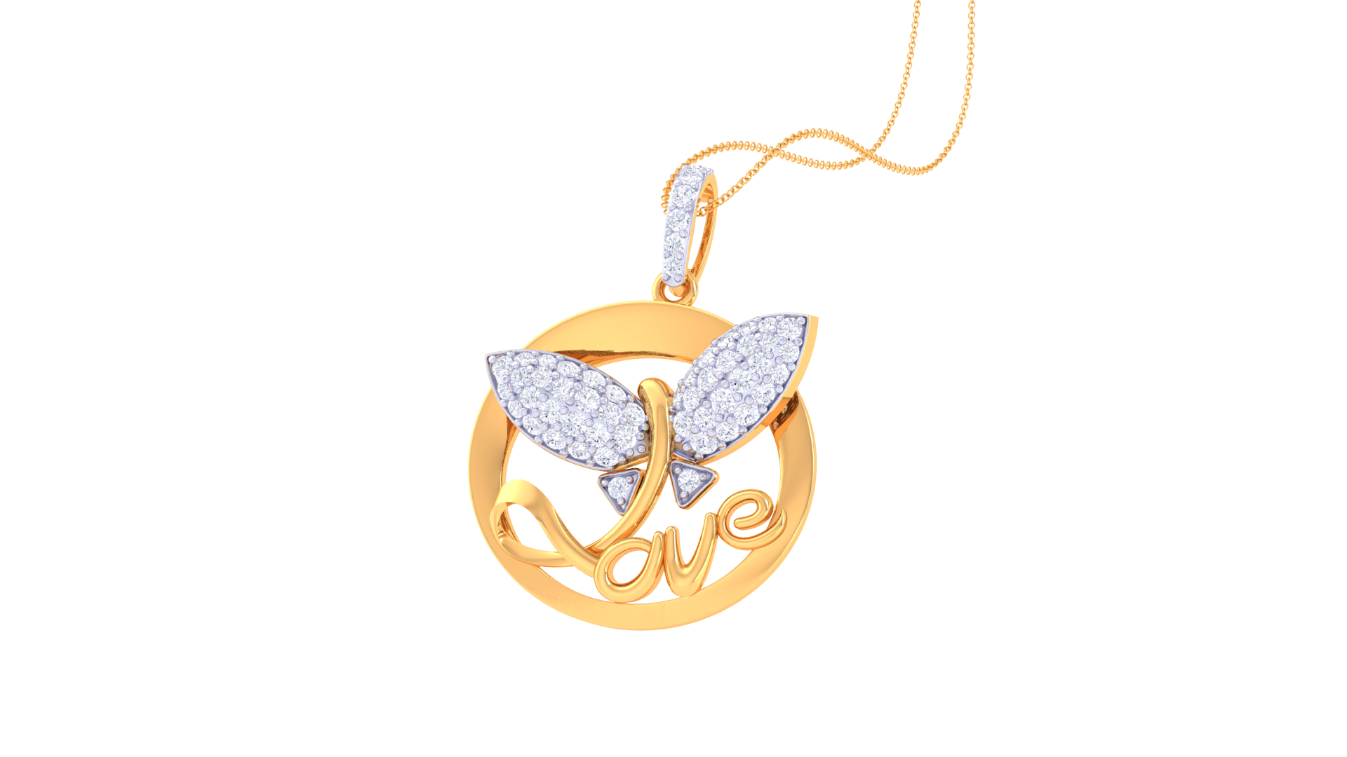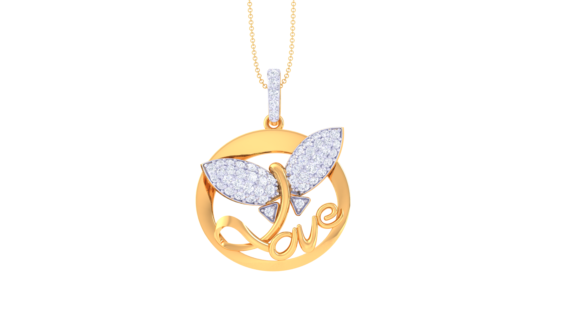 A graceful butterfly, shimmering with pave-set stones, flutters within a polished circular frame, while the word "love" is elegantly inscribed below—adding a romantic touch to the design.