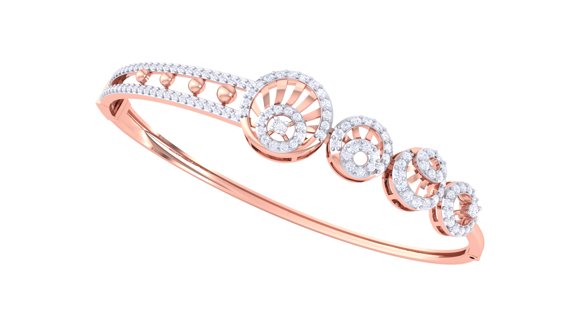 A series of circular motifs—some radiating with diamond-set lines, others fully encrusted—flow seamlessly across the wrist, creating a rhythmic visual harmony.