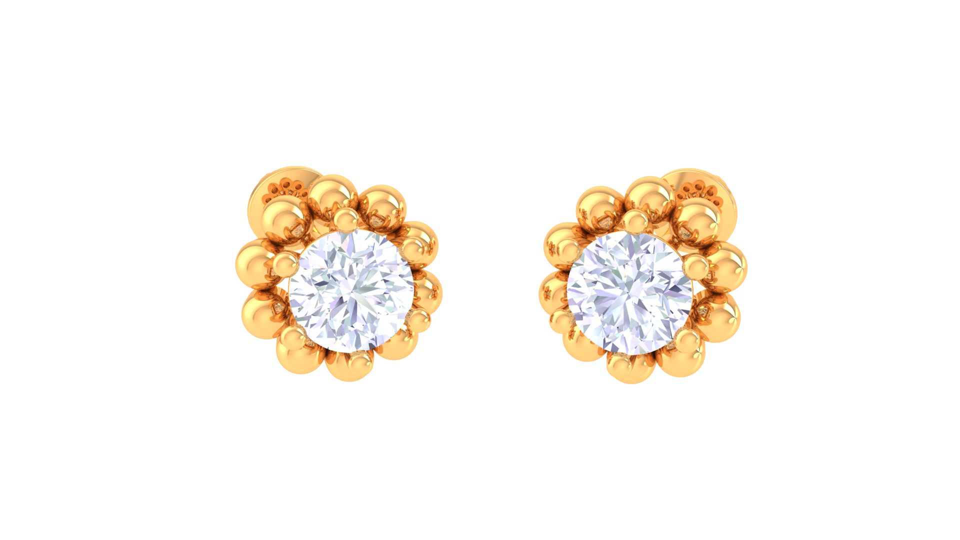 Each earring features a central round-cut diamond, surrounded by a symmetrical arrangement of polished gold beads that form a radiant bloom.