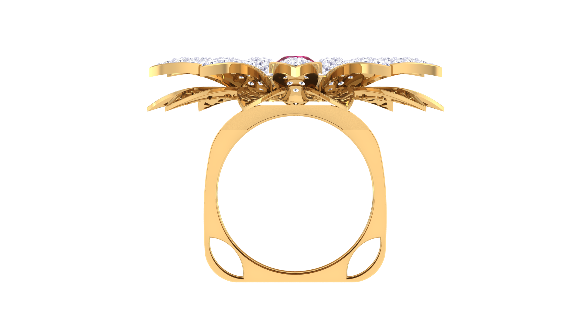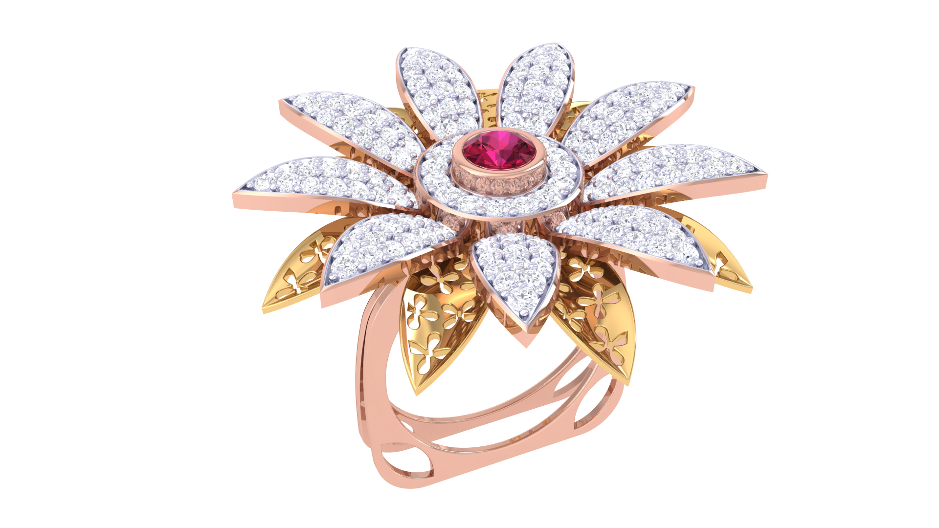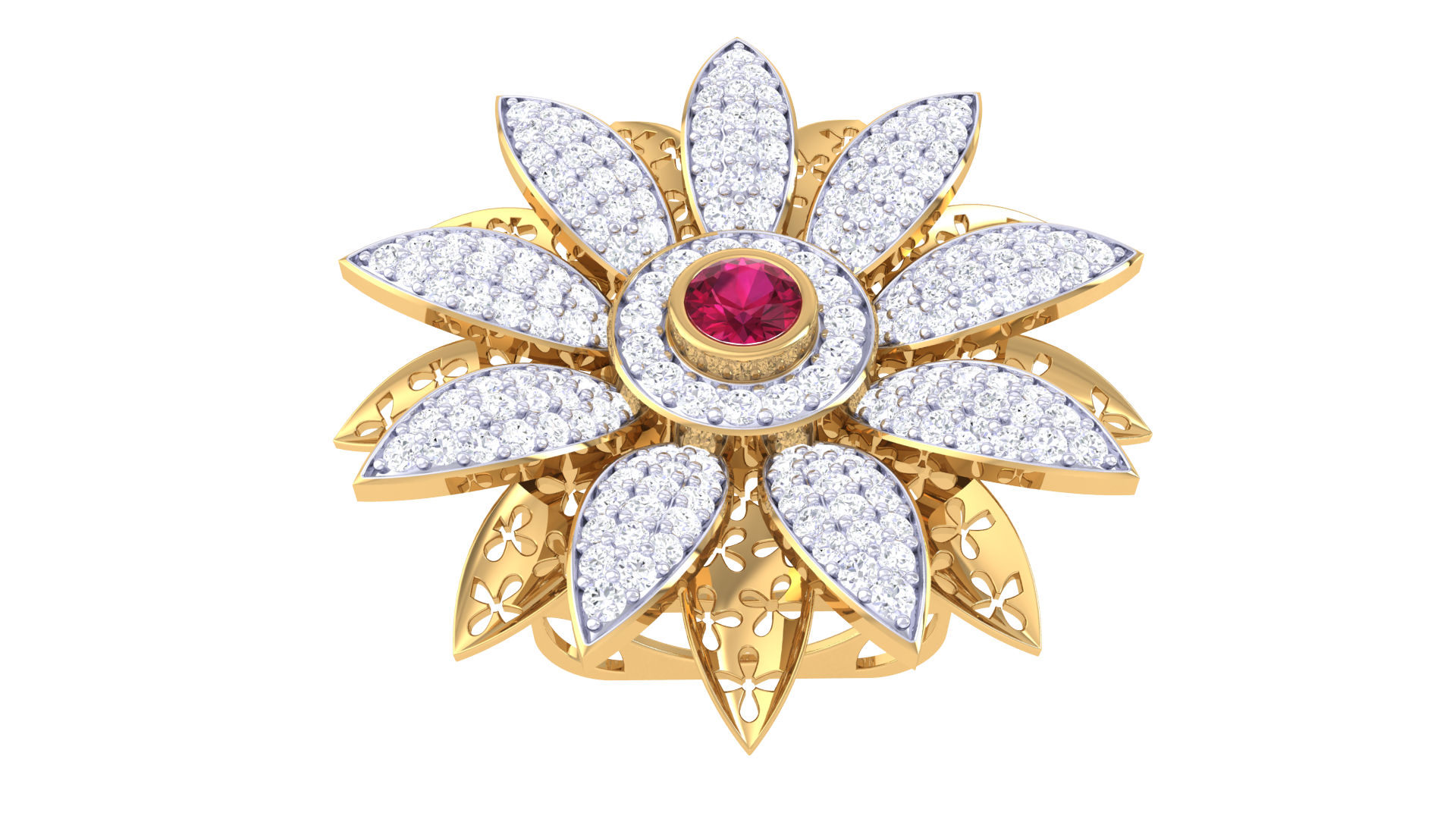 Crafted in 5.18 grams of gold, its layered petals are encrusted with 0.91 carats of brilliant-cut diamonds, forming a luminous halo around a fiery ruby centerpiece.