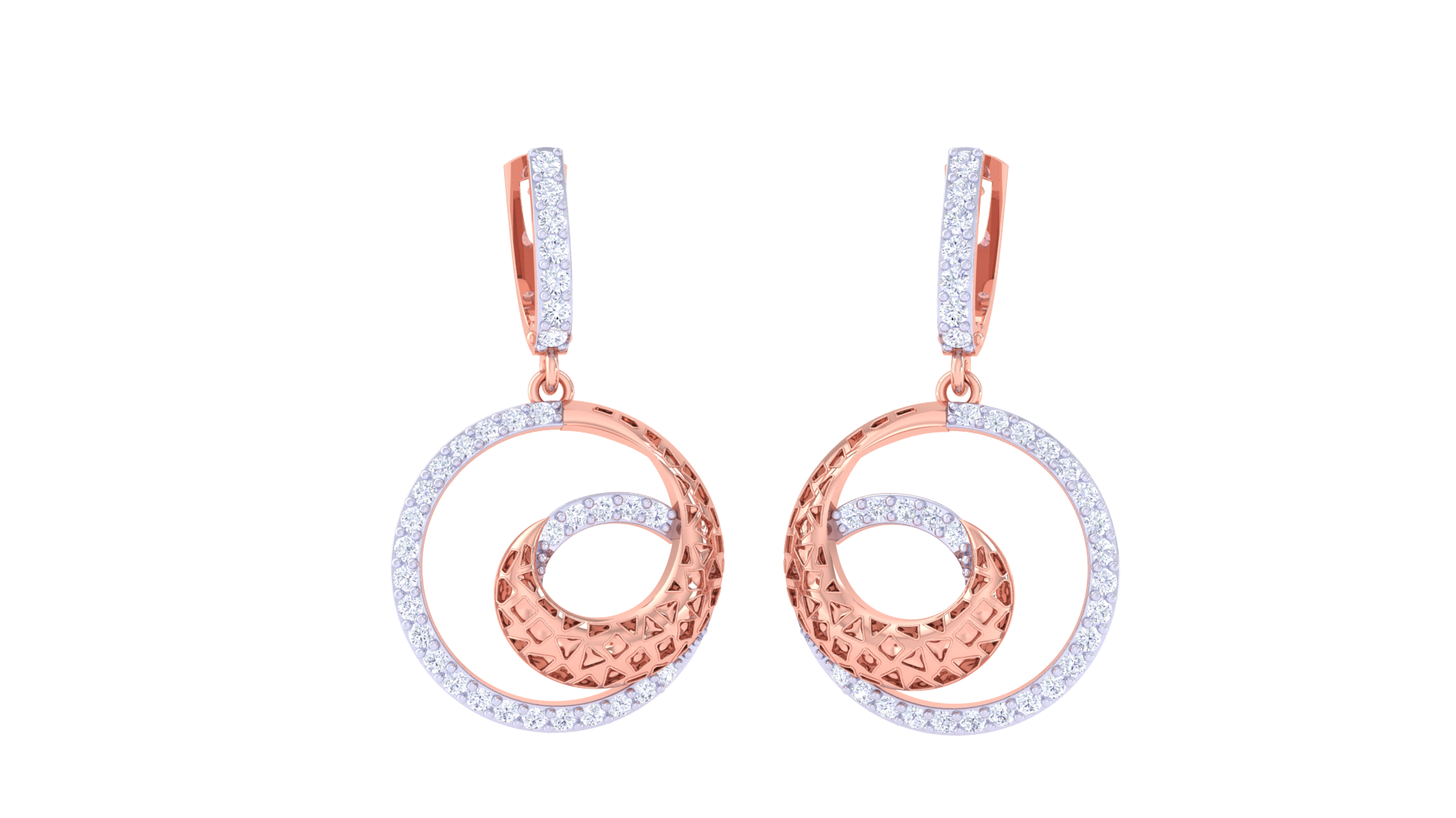 The design features a graceful swirl of geometric gold nestled within a glittering silver-toned halo, suspended from a diamond-studded vertical bar.