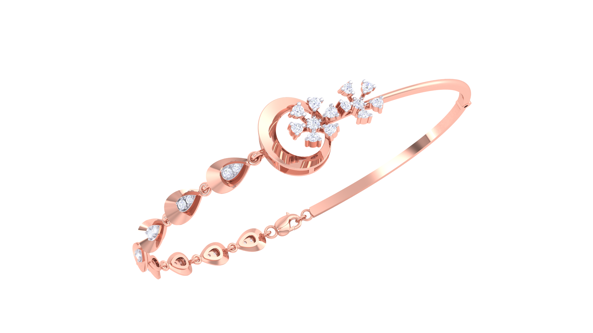 The bracelet flows into alternating teardrop and round links, each set with a diamond, creating a rhythmic interplay of shapes and shimmer.