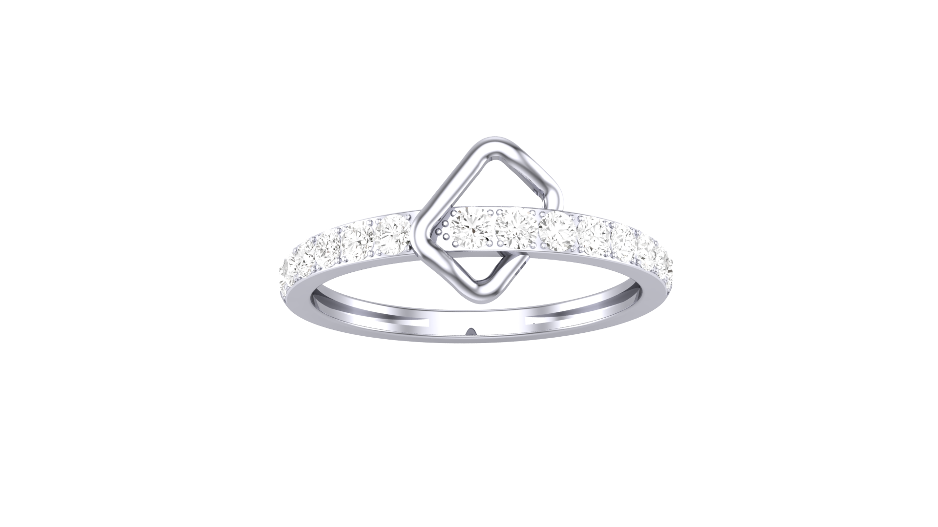 The geometric centerpiece seamlessly intersects the diamond-studded band, creating a sculptural silhouette that’s both minimalist and magnetic.