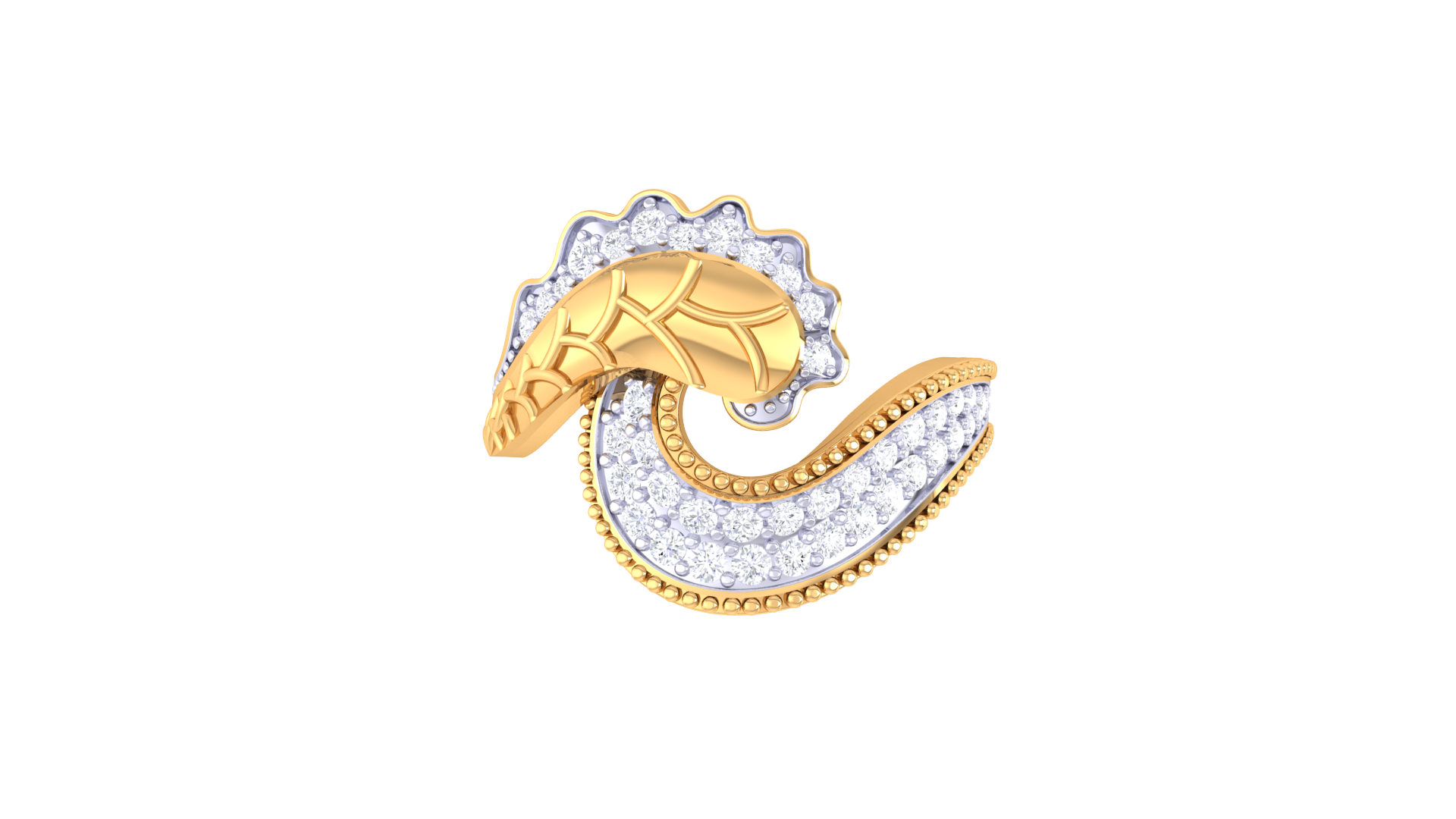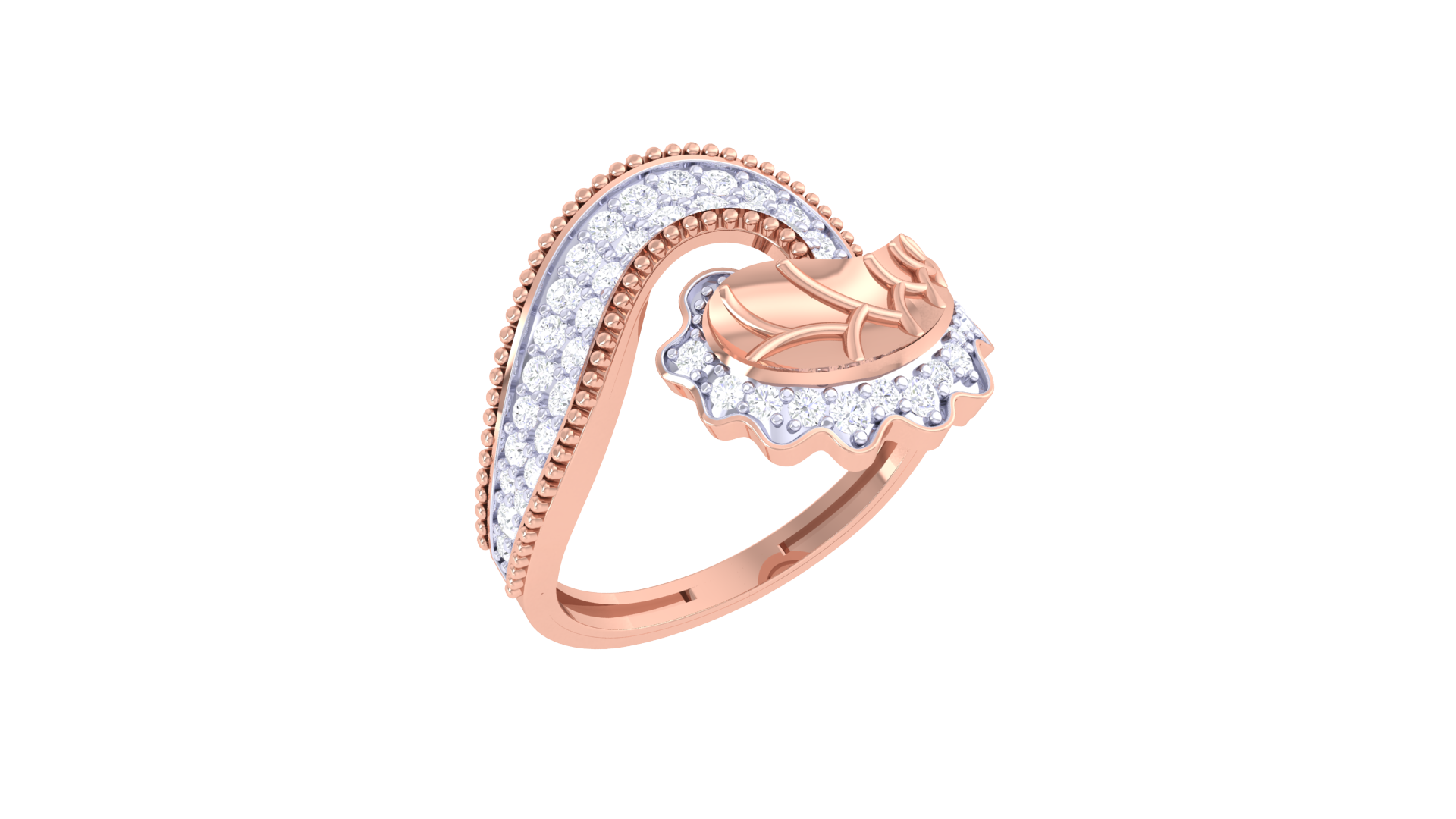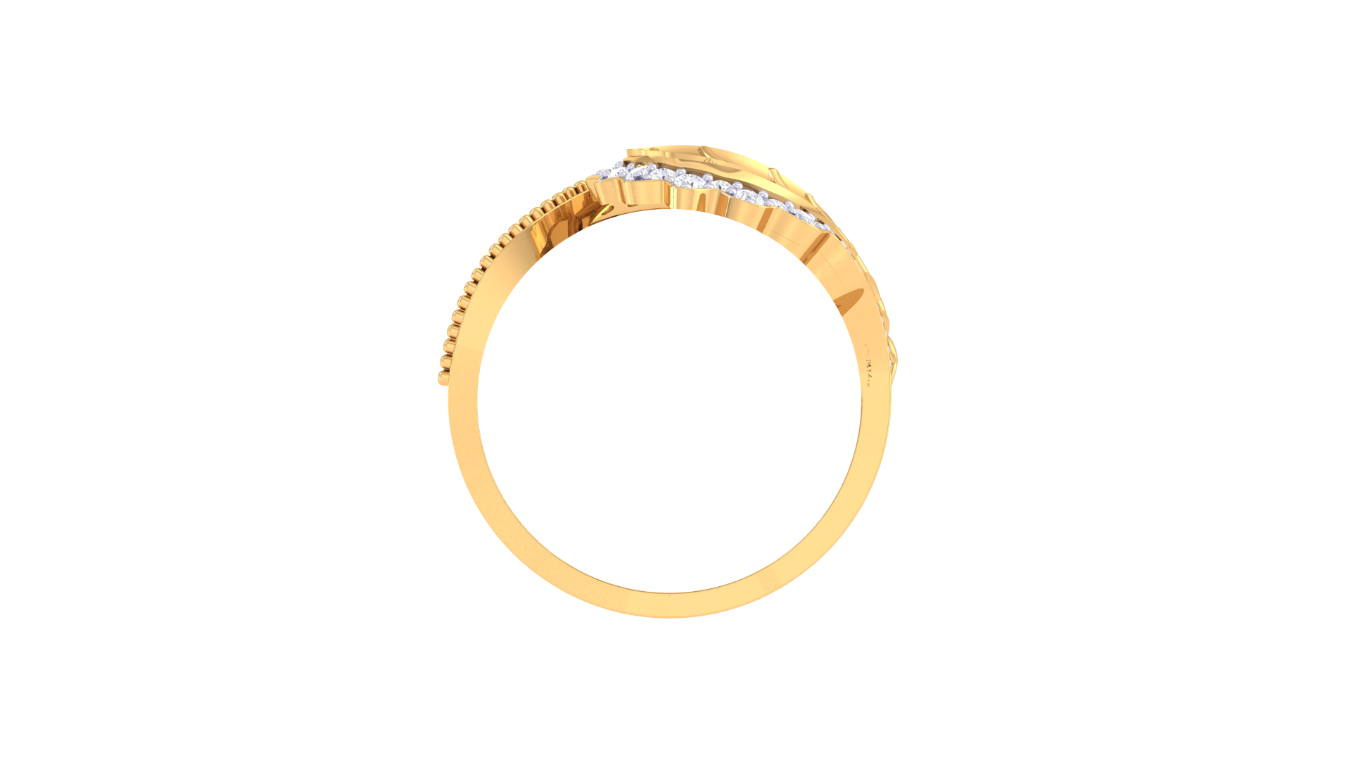 The asymmetrical band curves gracefully around the finger, adorned with 0.40 carats of pavé-set diamonds that shimmer like morning dew.
