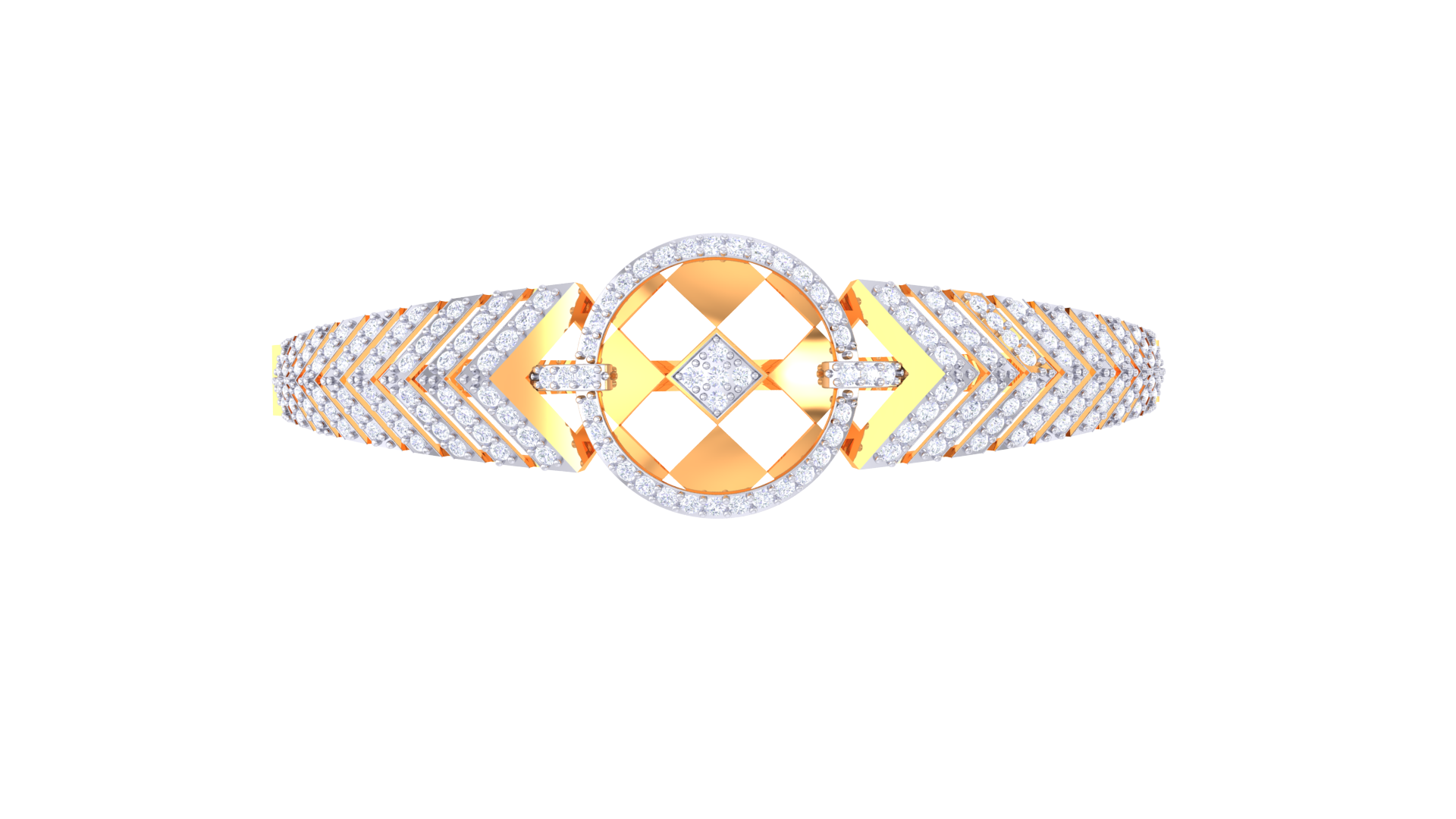 Flanking the centerpiece are chevron-inspired patterns, each meticulously set with diamonds that echo the bracelet’s symmetrical elegance.