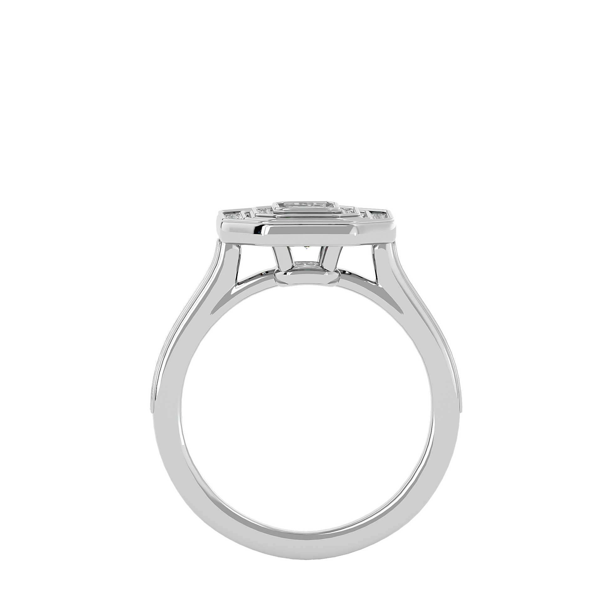 The sophisticated emerald shape adds a graceful elongation that enhances the stone’s clarity and sparkle.