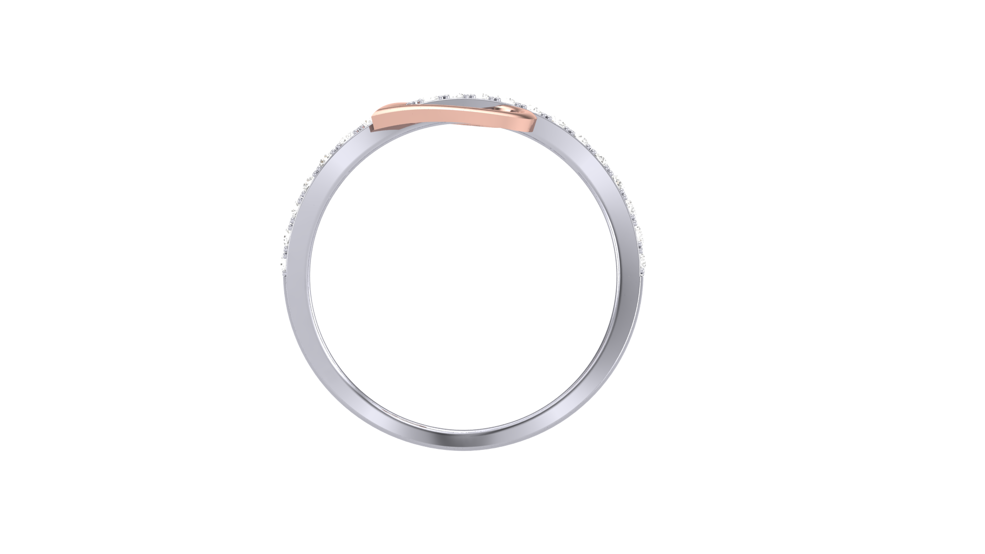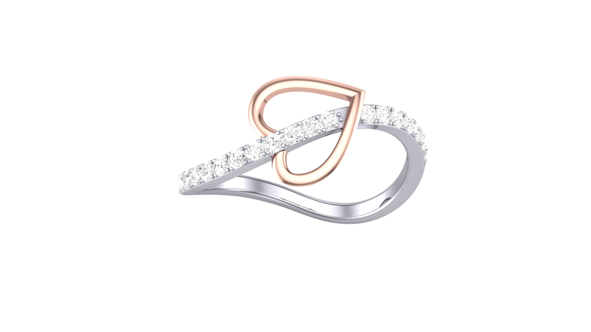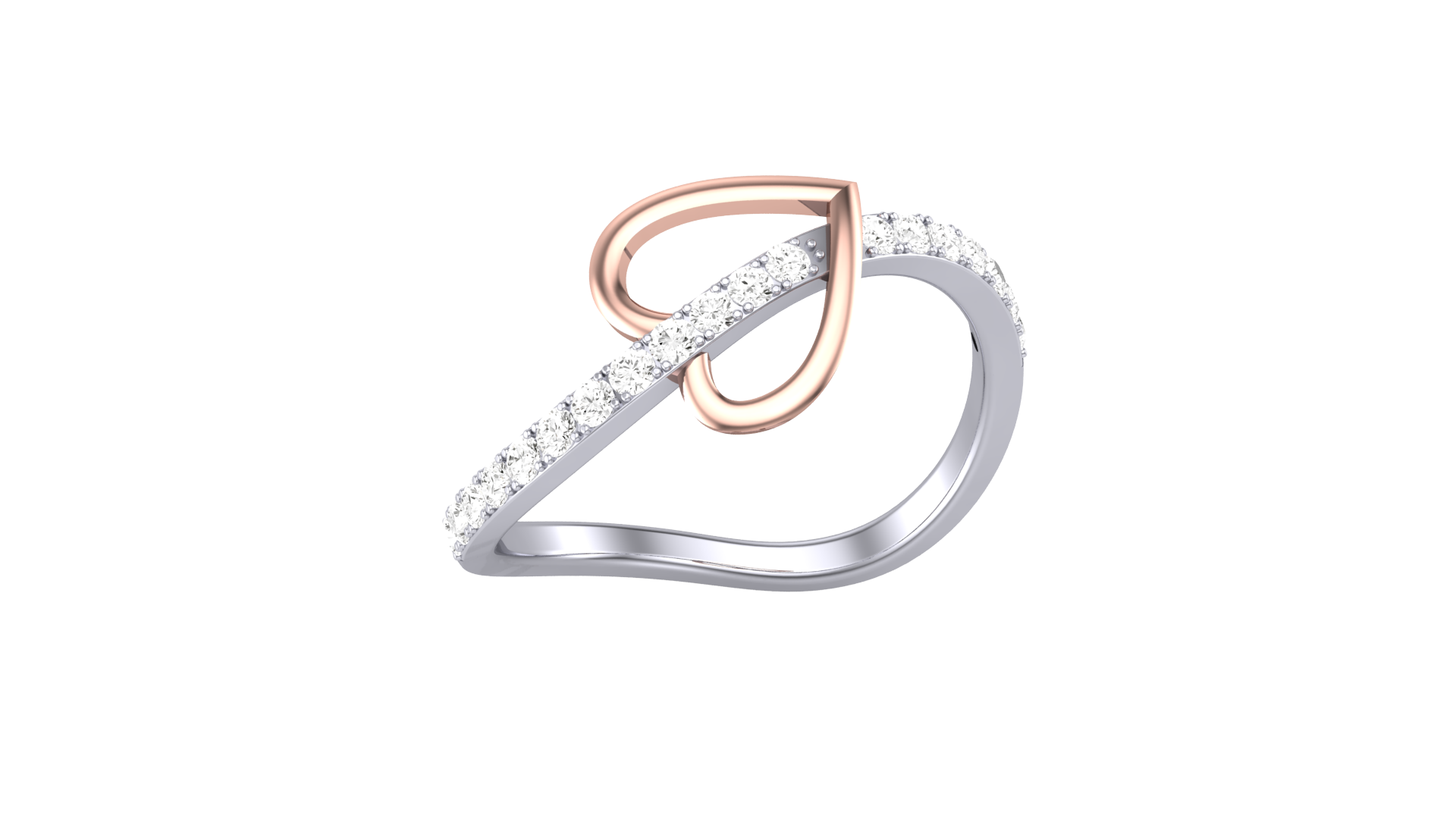 A sculpted rose gold heart crowns the design, symbolizing warmth and affection, while a graceful wave of 0.23 carats of brilliant-cut diamonds dances along the silver-toned band, adding sparkle and sophistication.
