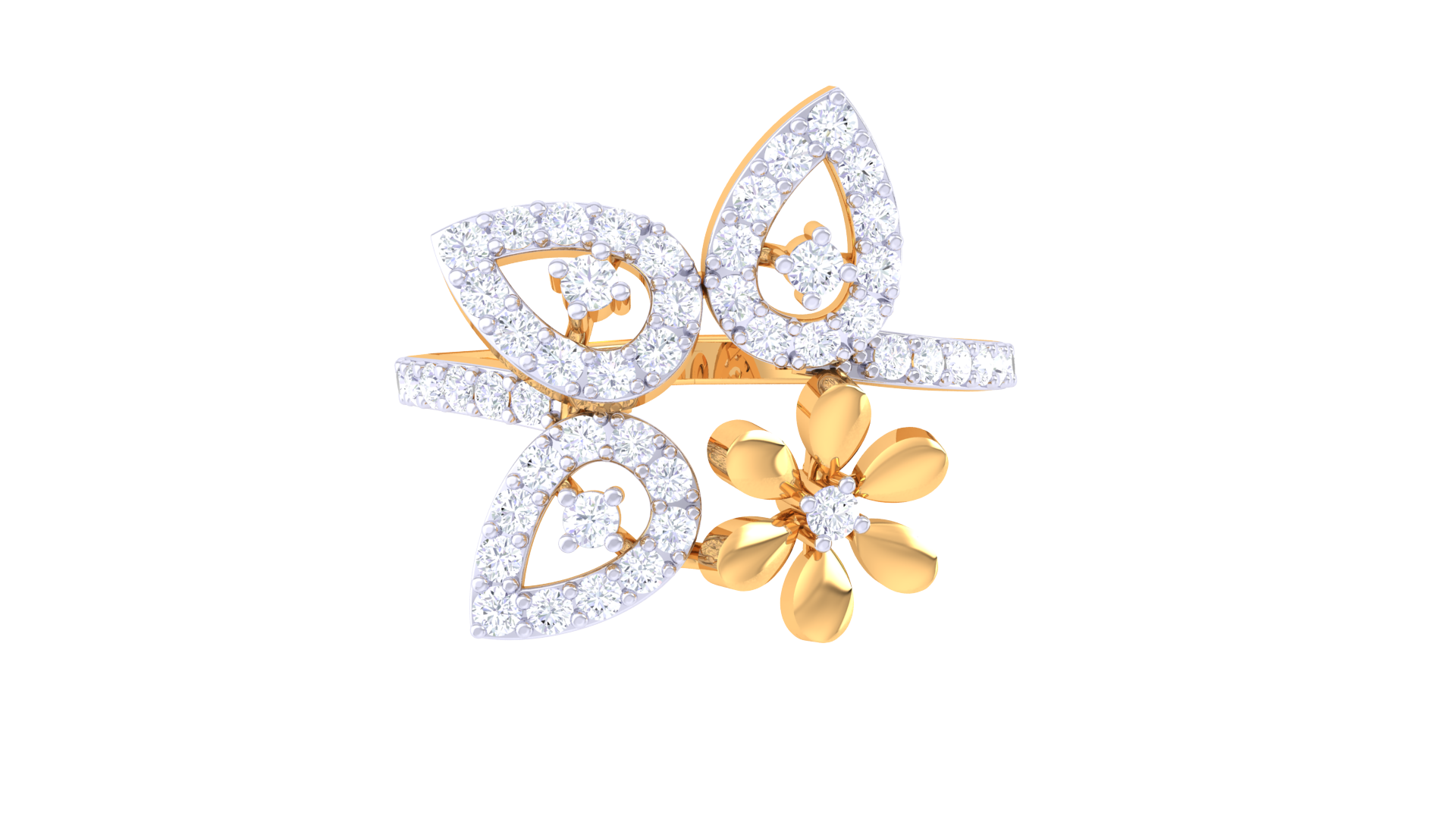 Handcrafted in 3.29 grams of gleaming gold, this exquisite piece features a central six-petal flower crowned with a brilliant diamond, surrounded by three diamond-encrusted leaf motifs arranged in a graceful triangular composition.