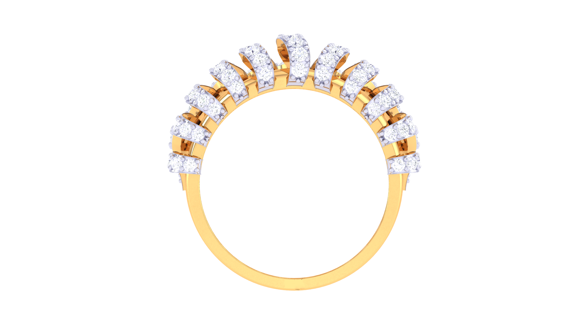 Wavy, sculptural forms rise from the band, each encrusted with brilliant-cut stones that shimmer against the polished gold backdrop.