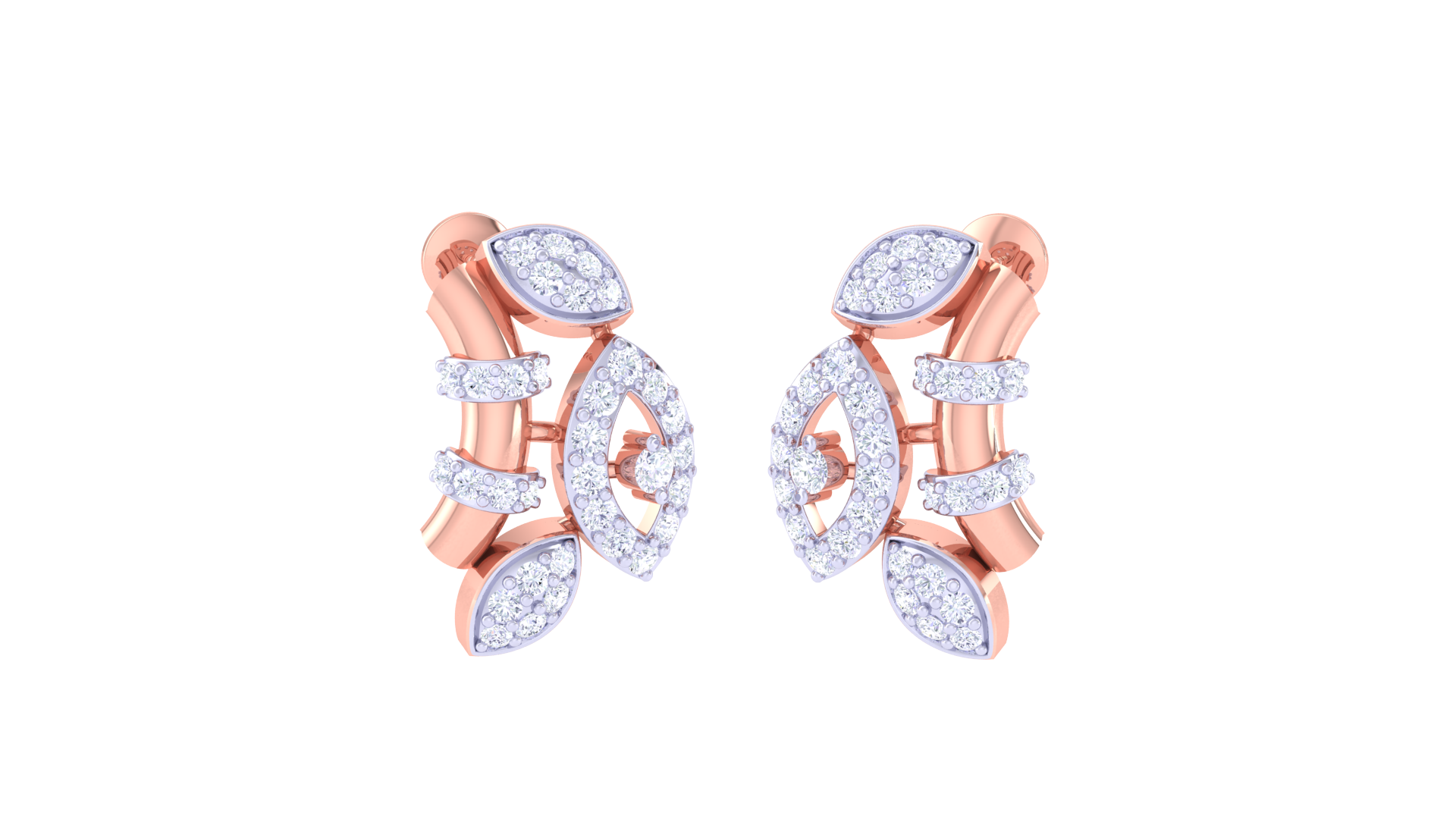 Each earring showcases a central openwork marquise form, surrounded by a harmonious arrangement of diamond-studded elements totaling 0.57 carats.