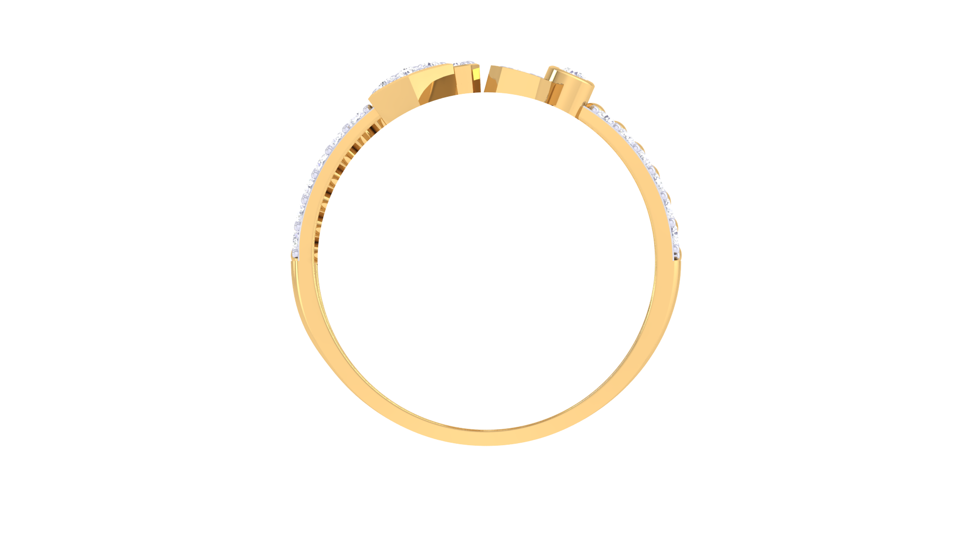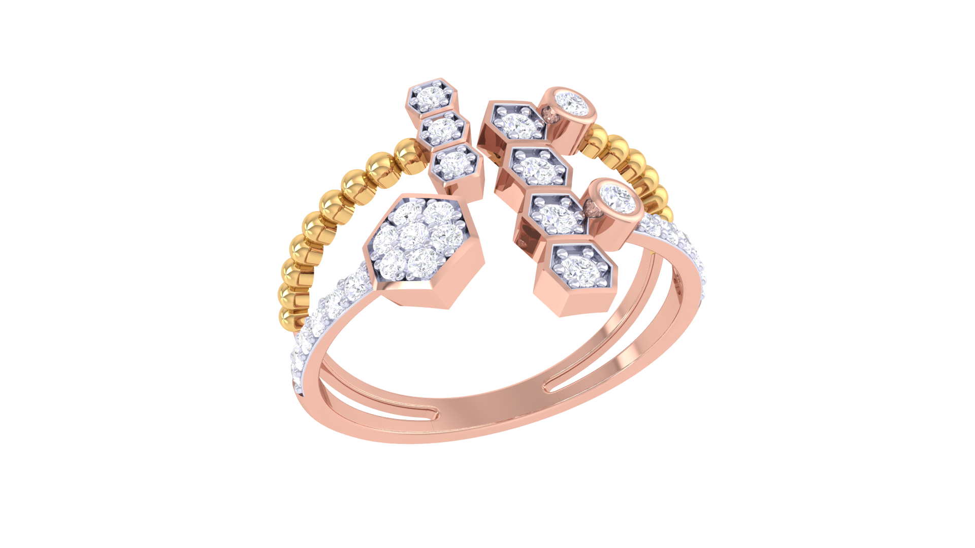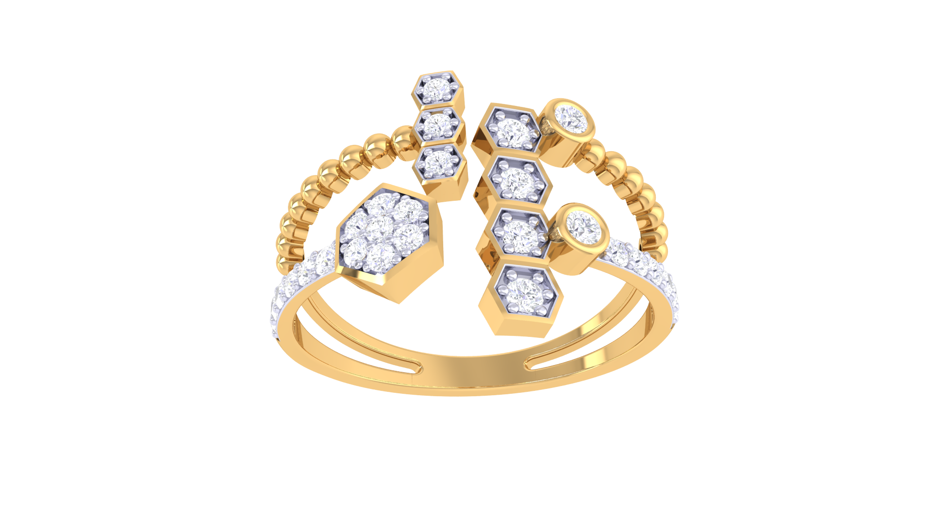 Featuring 0.25 carats of brilliant-cut diamonds set in hexagonal and circular bezels, the split shank design branches into a dynamic arrangement of gold beads and staggered diamond clusters.