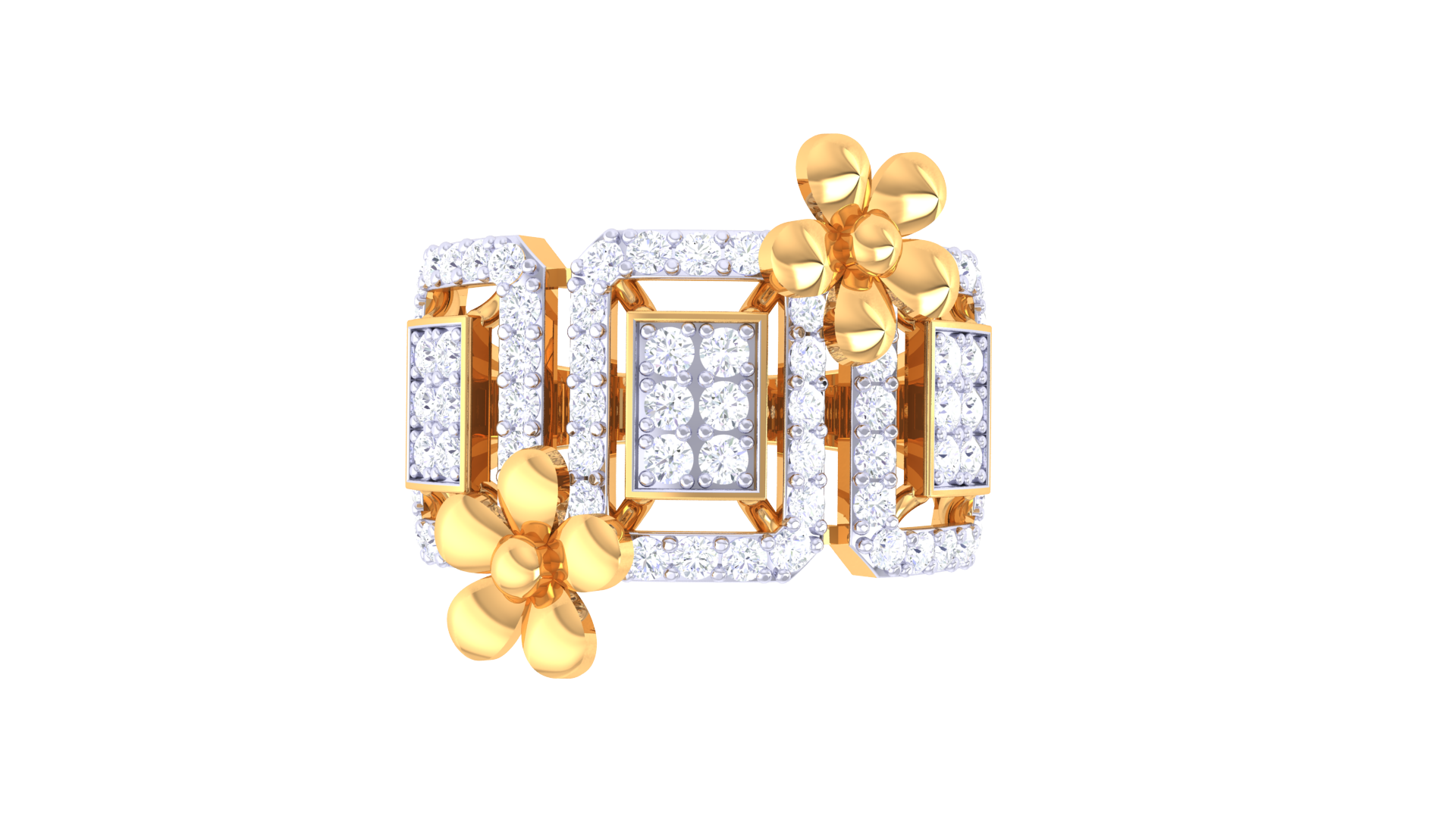 Three sculpted gold flowers bloom across the top, adding a touch of organic elegance, while the segmented band—set with rectangular diamond-studded panels—brings a modern architectural edge.