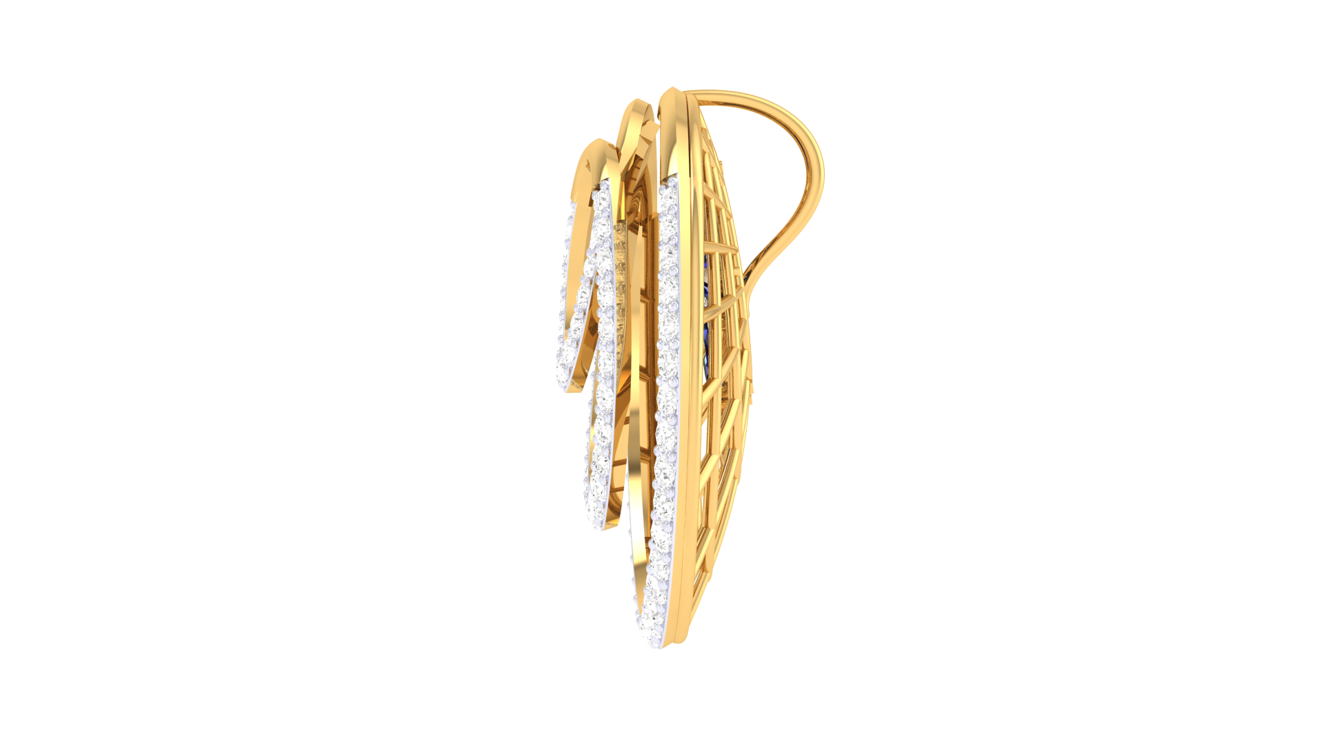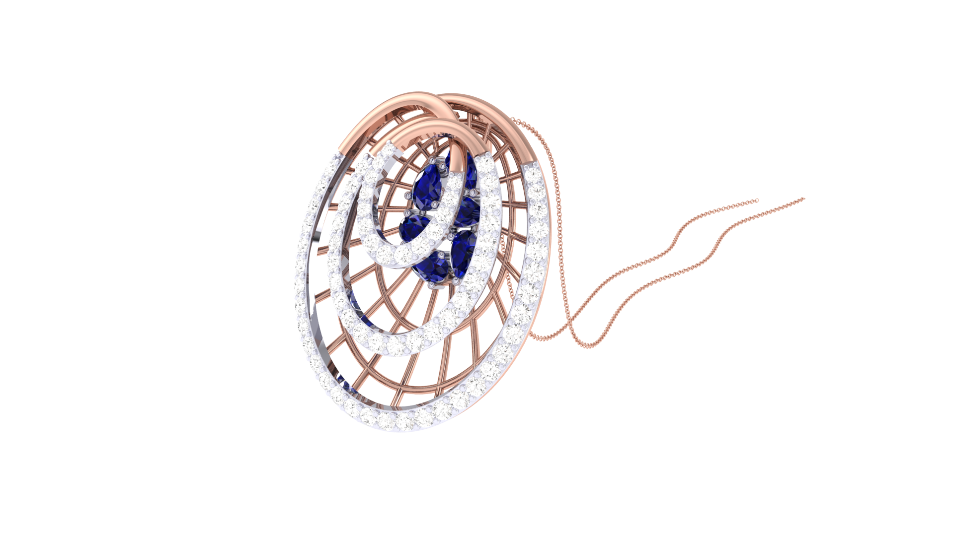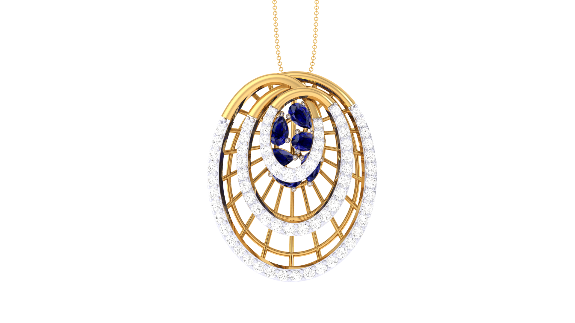 Concentric diamond-studded rings frame a trio of deep blue gemstones at the center, while radial gold bars and geometric detailing add depth and dimension.