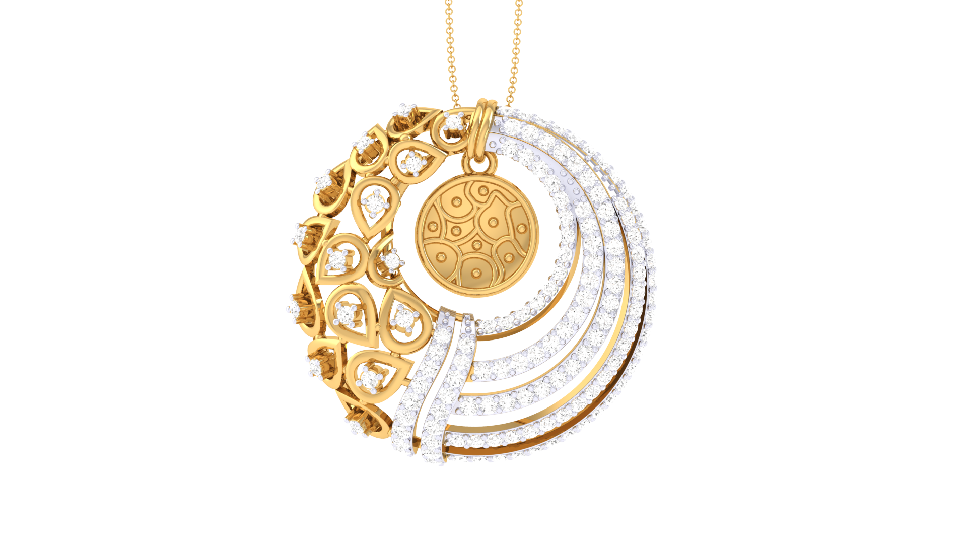 A stunning interplay of tradition and modernity, this circular pendant is crafted in 4.32 grams of radiant yellow gold and adorned with 0.86 carats of brilliant-cut diamonds.